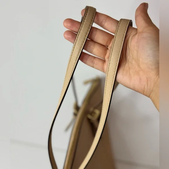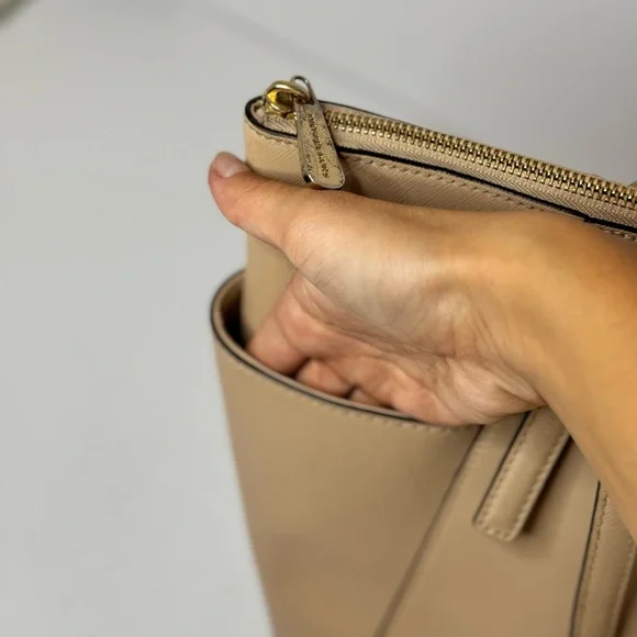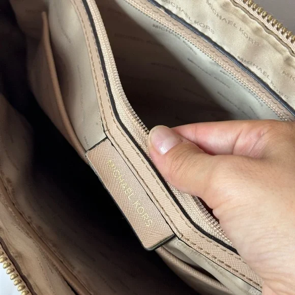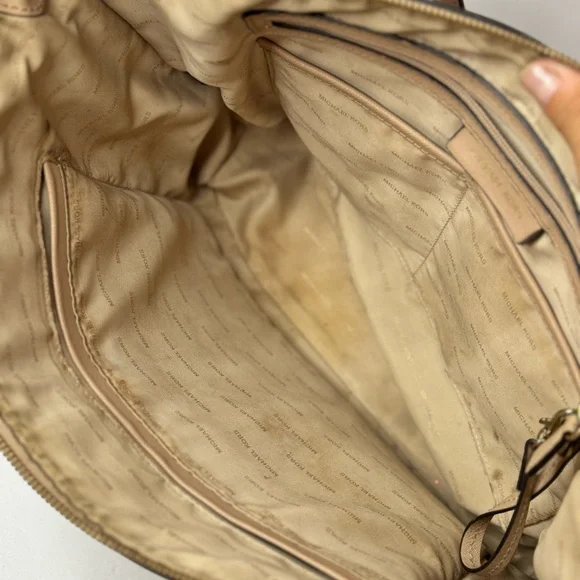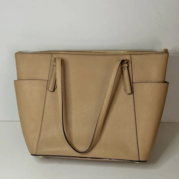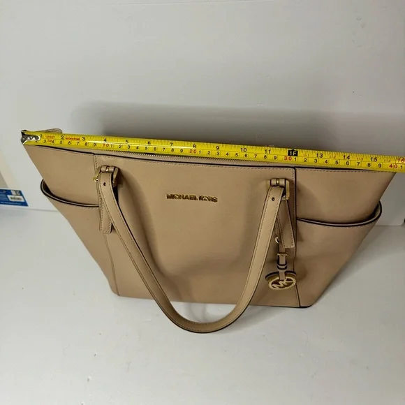 Michael Kors Jet Set Travel TotePre-owned Very Good Condition - just need some deep cleaning interior Oyster Beige Leather2 Exterior Side PocketsBag CharmTop Zip ClosureFabric Lining1 Interior Zip Pocket4 Interior Slip Pockets1 Interior Key FobMeasures: 15.5” x 10” x 4.5”Double Adjustable Shoulder Straps 9.25”Comes from a smoke and pet free home