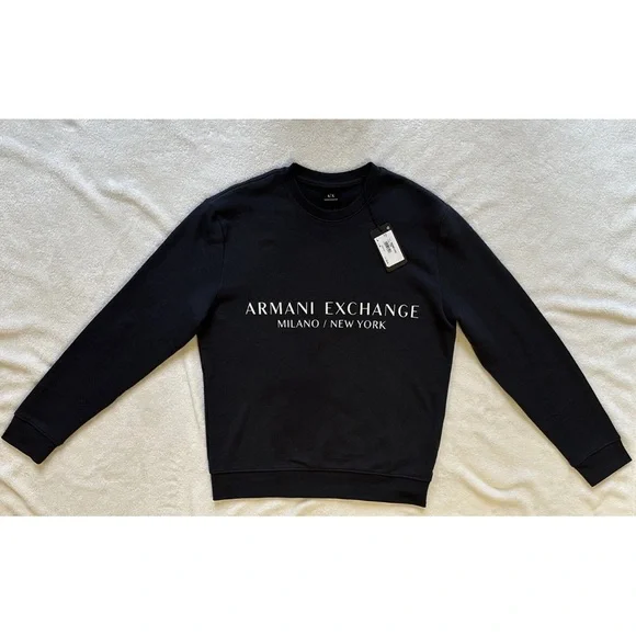 Experience the perfect blend of style and comfort with the Armani Exchange blue crewneck sweater. Featuring a sleek design with a prominent white logo, this sweater is crafted for a modern, sophisticated look. Its classic crewneck silhouette and ribbed cuffs make it a versatile addition to any wardrobe.
