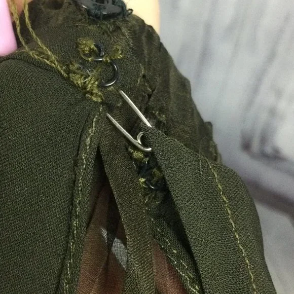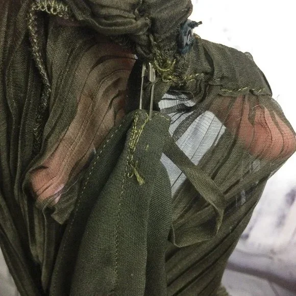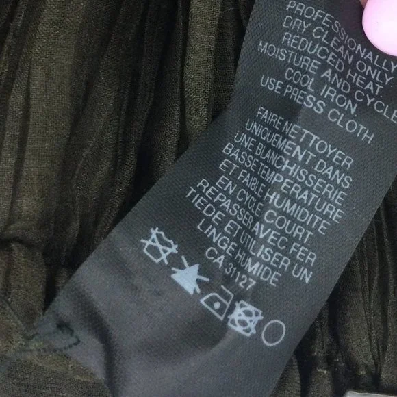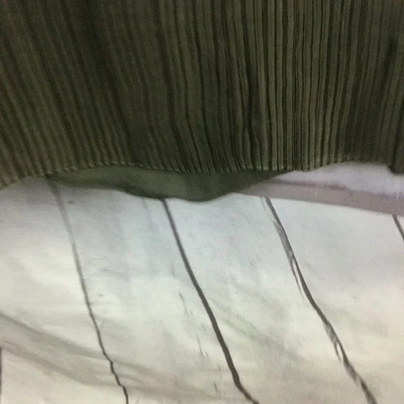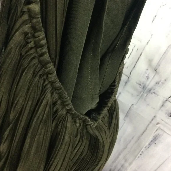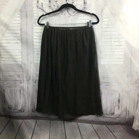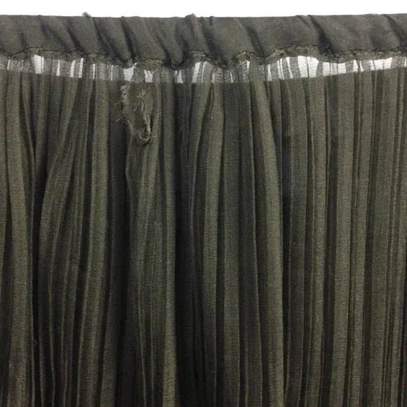 Size: 10Brand new couture skirt from Donna Karen. Dark green that looks brown in some lights. Midi length with pleating all around.The lining does separate from the sheer pleating piece with small side straps/snaps. One of the snaps is missing half so it's been pinned together to keep it secure, should be an easy fix by a tailor. Otherwise it's in good new condition. Waist: 14"Length: 27"flat lay
