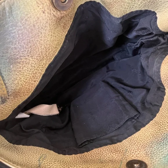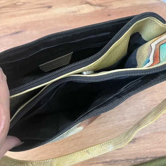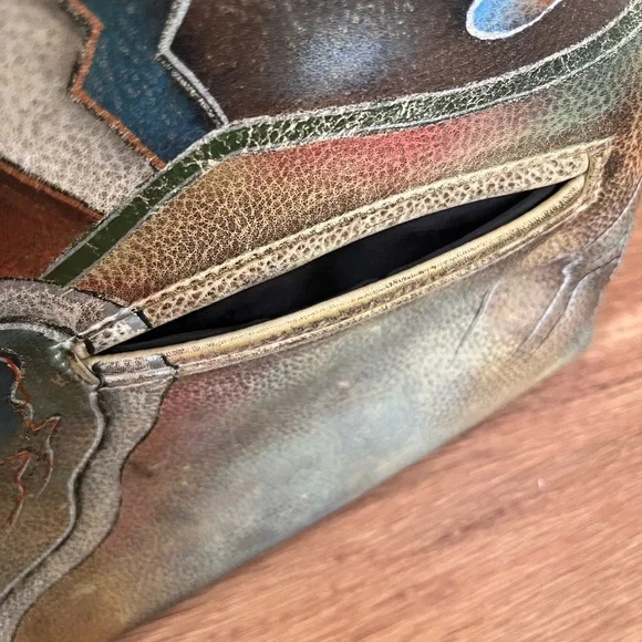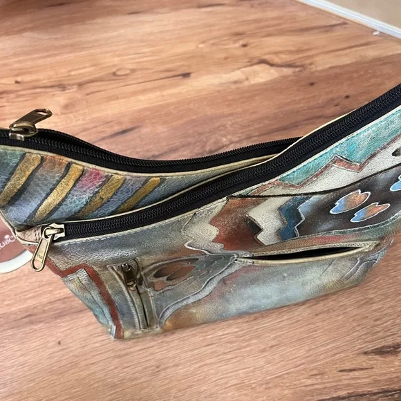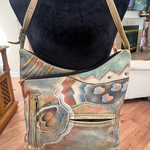 Beautiful hand painted leather bag, tons of pockets. Double cross zip top with a center magnetic snap pocket.Outside slip pockets interior zip pocket.Good used condition, some corner/strap wear Approx 11” across, 10” tallShoulder bag, adjustable strap. Like the item but not the price?All reasonable offers happily considered. Fast shipping, pet/smoke-free home