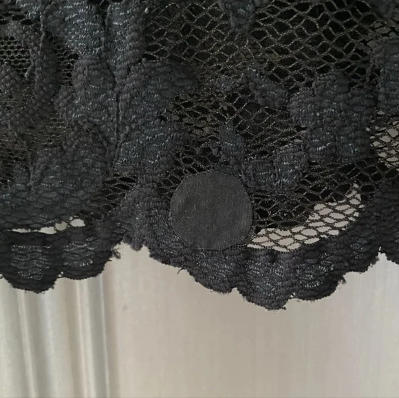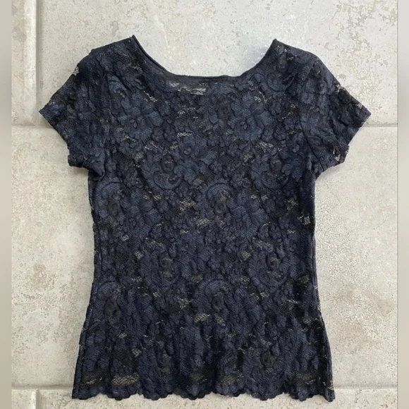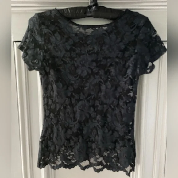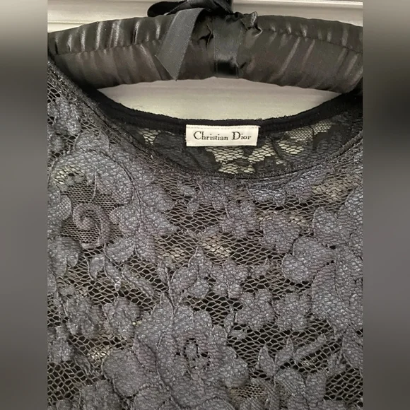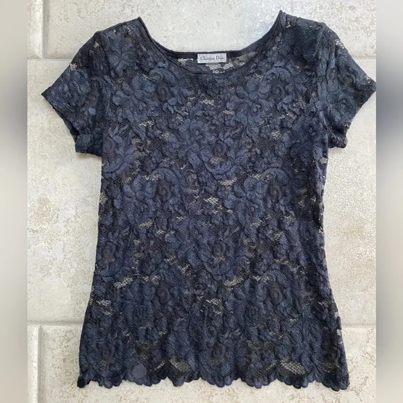 Vintage Christian Dior Floral Lace Sheer Cap Sleeve Crew Neck TopThis top is romantic.Wear it with the ball skirt or under a jacket with a pair of jeans. It has beautiful floral lace.The lace has some stretch.Cap sleevesFinished crew neckSize, Small Color, Black Closure, Pullover Fabric content, Polyester , spandex Hand wash in cold water, air dry flatMeasurements are taken across the front and unstretched.Underarm to underarm, 16”Sleeve inseam, 1.25”Length, from top of shoulder to hem, 22”Condition, Preowned and Very Good2 Small patches applied at front, bottom right. See photo. They are hard to see because they are black and blend with the design. Smoke free and pet free environmentPlease review photographs.