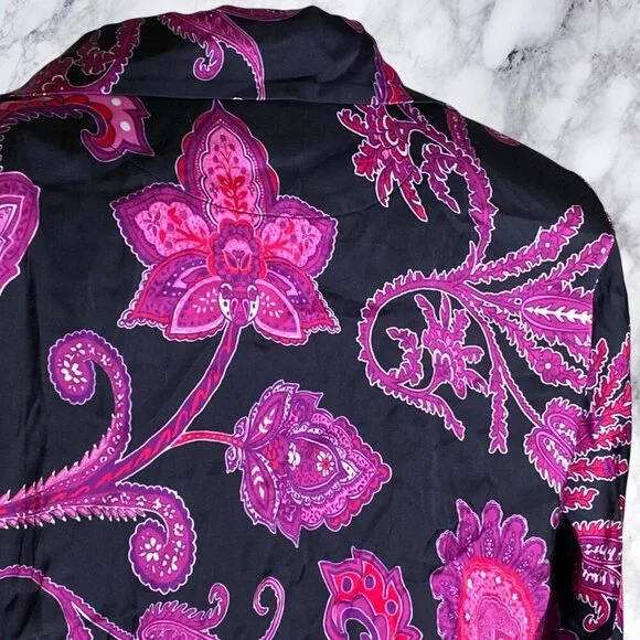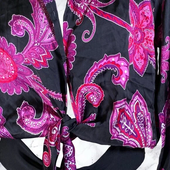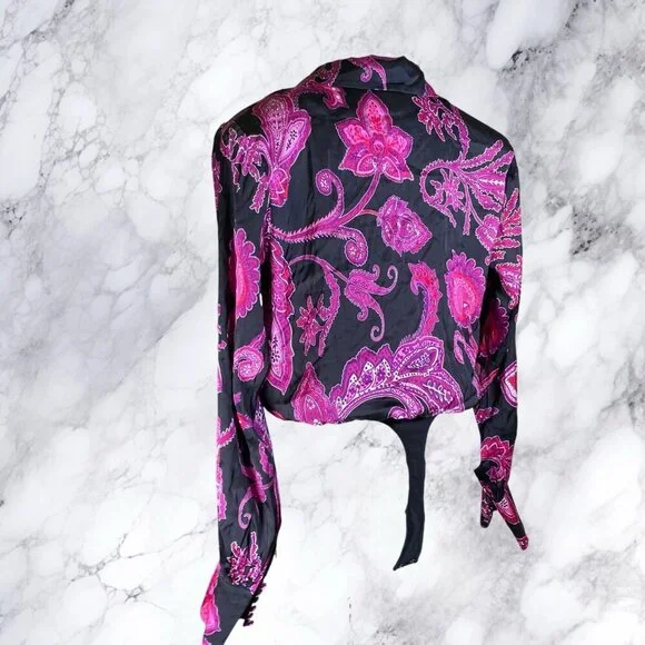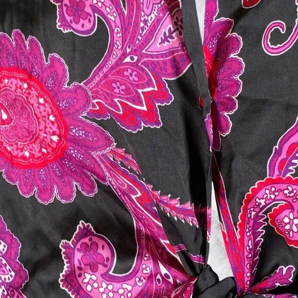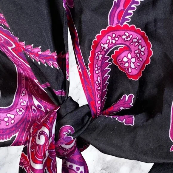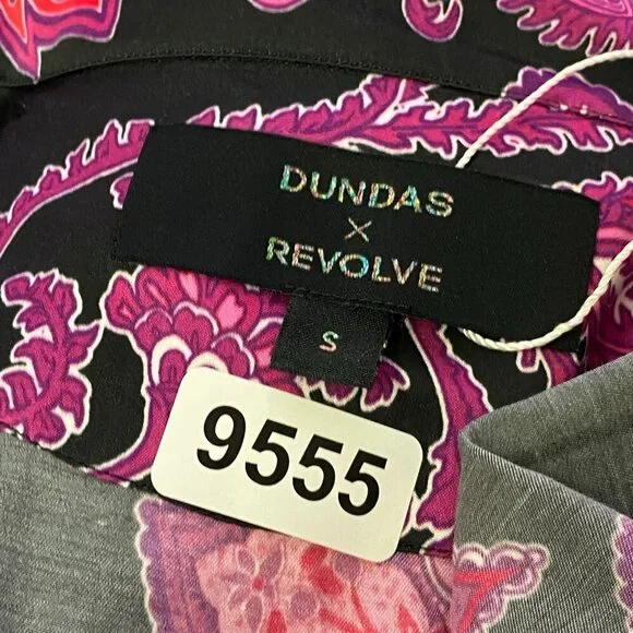 DUNDAS x REVOLVE Delirium Bodysuit - Black Purple PaisleySelf: 53% viscose, 44% rayon, 3% spandex.Contrast Fabric: 95% poly, 5% spandex. Hand wash. Front button closure and waist tie. Padded shoulders and zipper closure at cuffs. Gusset snap button closure. Thong back. Matte satin fabric. Never worn, new $228 retailSold out styleYes we bundle!We cannot advise on sizing or fit, thank you Spell and the gypsy collective zimmermann