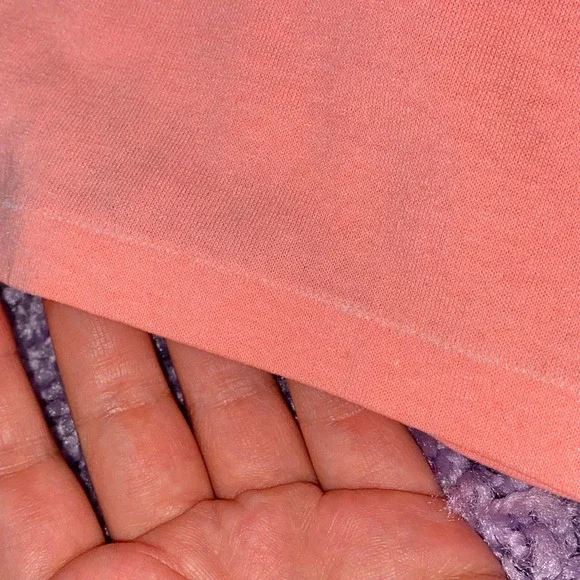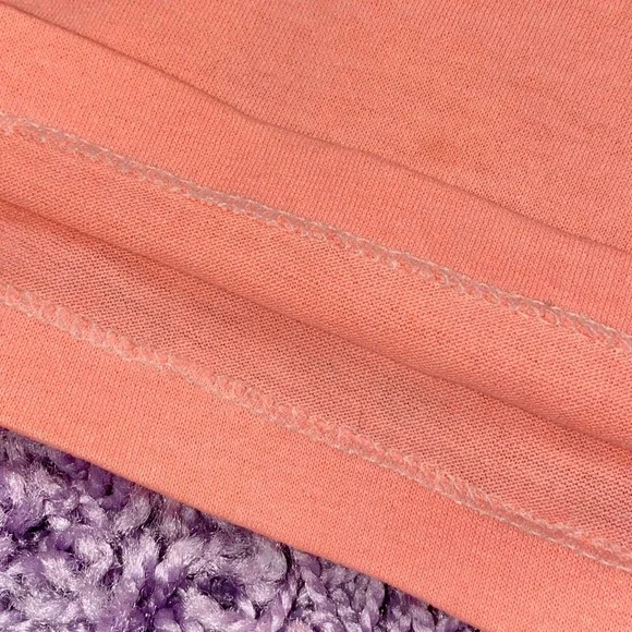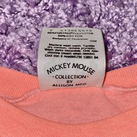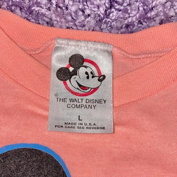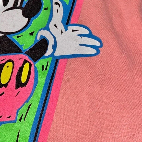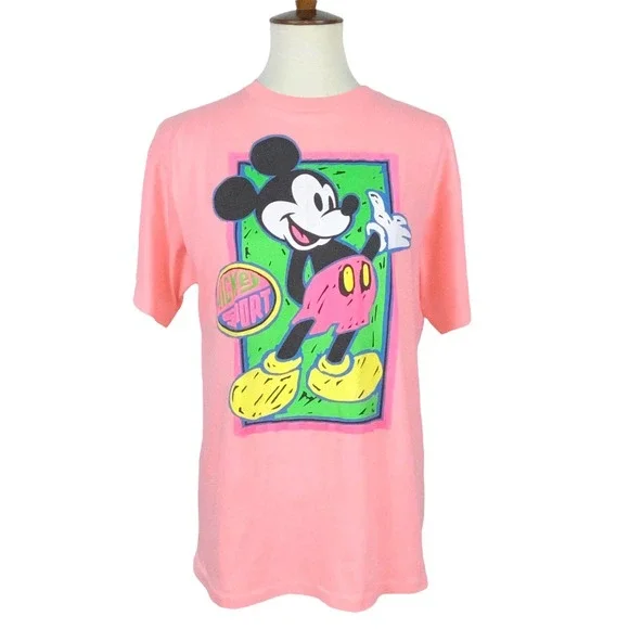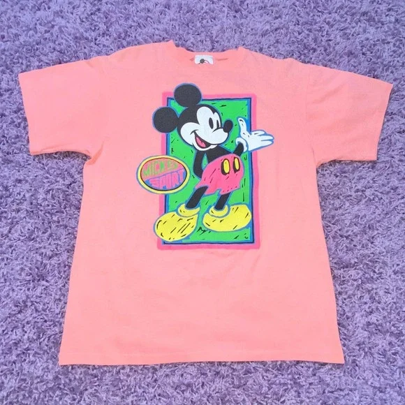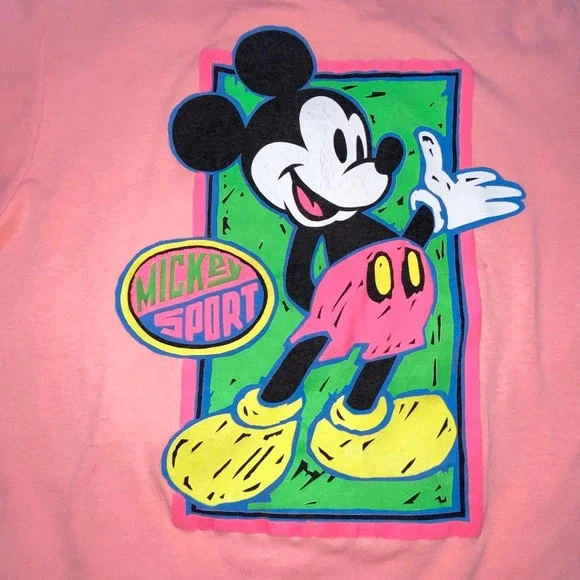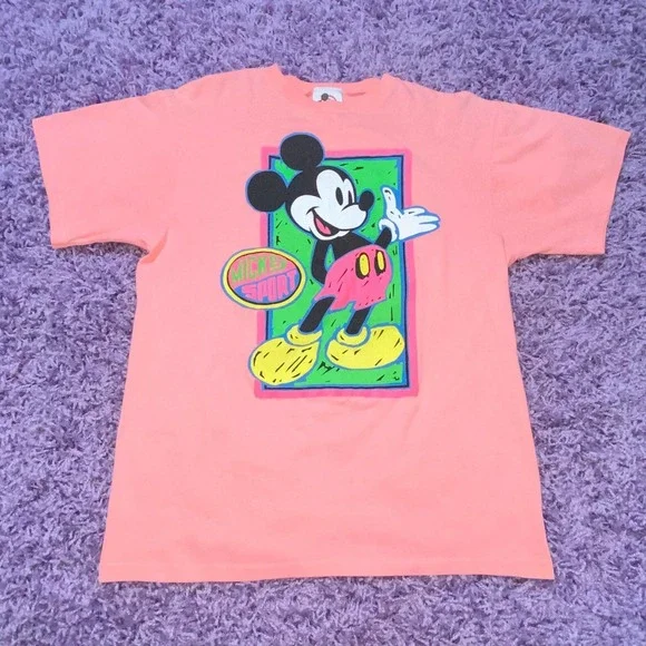 Vintage 80s Walt Disney Company Mickey Mouse Sport Short Sleeve Soft & Thin Neon Salmon Colored Cotton T-Shirt with Colorful Neon Puff Paint Design. Single Stitch. Made in the USA. Has slight cracking to the graphic and two faint discolorations under his hand. Overall excellent vintage condition. Brand: The Walt Disney CompanySize: LargeMaterial: Polyester/Cotton*Measurements*Bust: 19.5” Waist: 19.5” Length: 24.5”