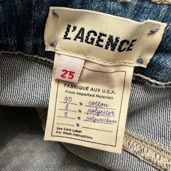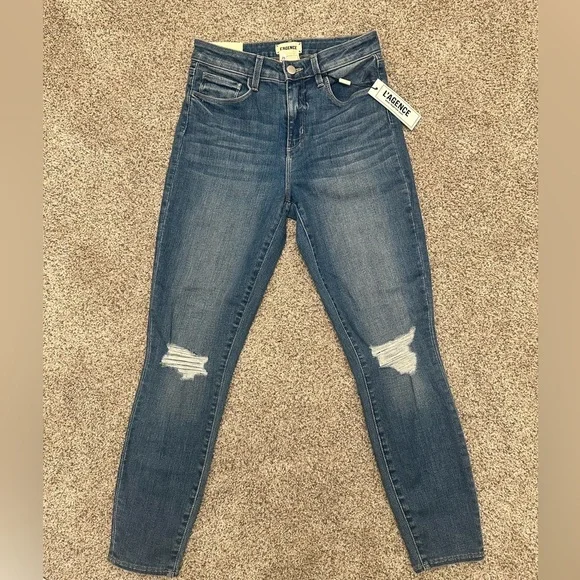 L’Agence Margot High Rise Skinny Slim in Syracuse Women Size 25 NWT $265 MSRP *New with tag👖Margot👖Skinny👖High Rise👖Color: Syracuse 👖Slight Stretch👖Distressed at the knees👖New with tags$265 MSRPApproximate DimensionsLength: 36.75 in (from back tab to ankle)Inseam: 26 inWaist Width: 13 inRise: 10 in⚠️Please review measurements and photos before ordering.The best way to know if this size & style is best for you is to measure a similar pair of jeans and compare to the measurements above.Fabric90% Cotton8% Polyester2% PolyurethaneTags: L’agence, Revolve, Nordstrom, designer, denim, jeans, high rise, modern skinny, Margot, classic, high end, distressed, slimNew to ?Use my referral code Shauna_Magnusen to register & receive $10 off your first purchase!
