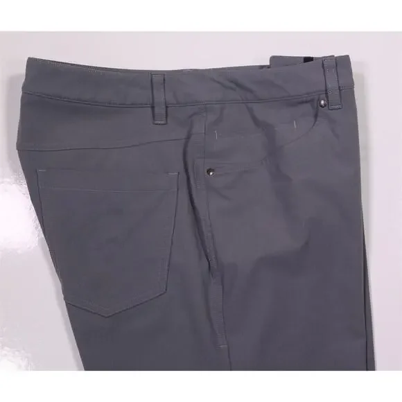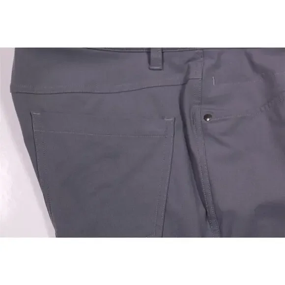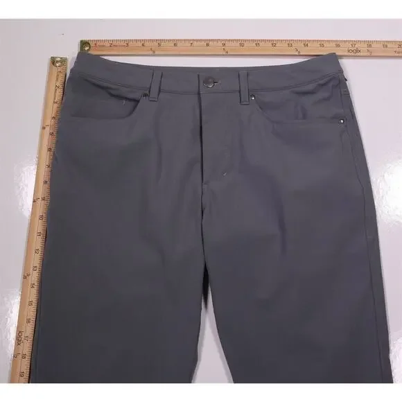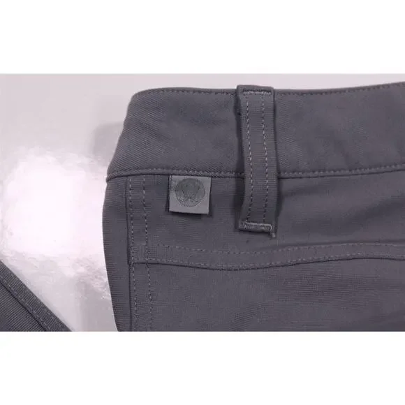 Brand: Lululemon * Measurements (Laying flat, Unstretched):Waist: 32 inches (extra material to waist 0 inches)Inseam: 31 inches (extra material to inseam 0 inches)Rise: 10 inchesOpening at the hem: 7.25 inches* Material: 100% Polyester - Warpstreme - Weight: Medium to Light Weight* Color: Gray* Design: Solid* Features:Flat FrontUncuffed HemsJean Style Front PocketsNot Lined to the KneesTwo Back Pockets* Condition: Like new. Gently Used. No stains or tears.* Inventory Code #P8896Powered by SixBit's eCommerce Solution