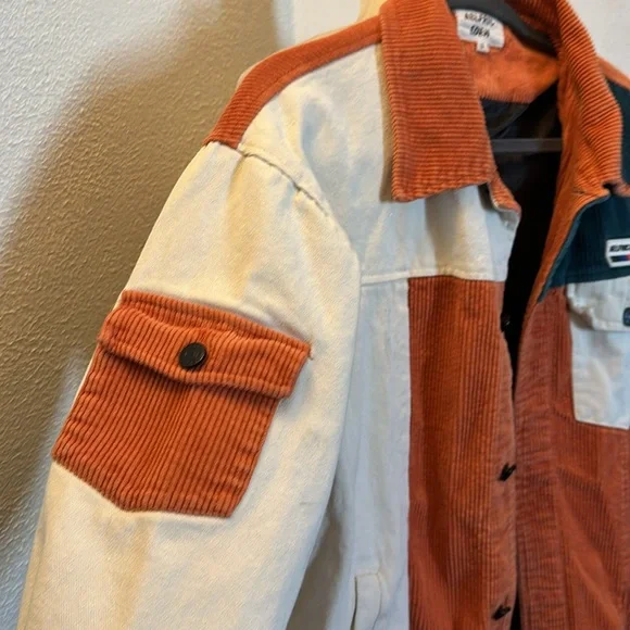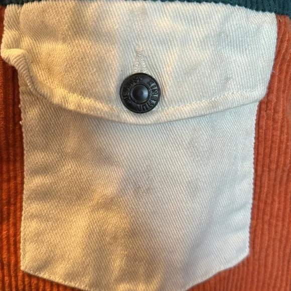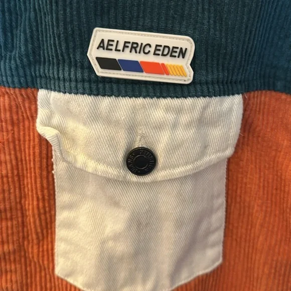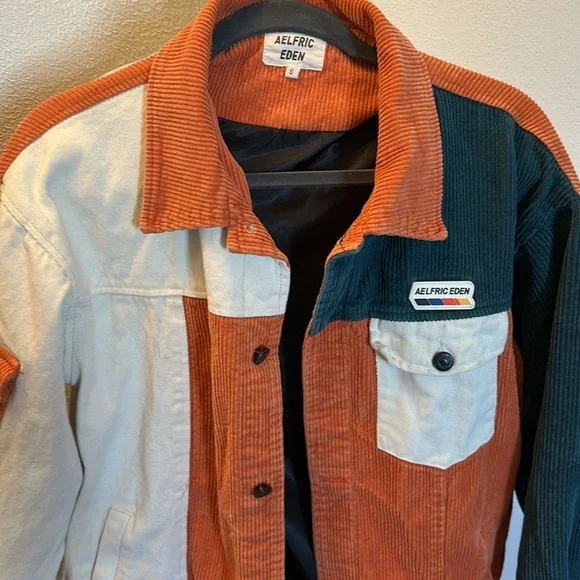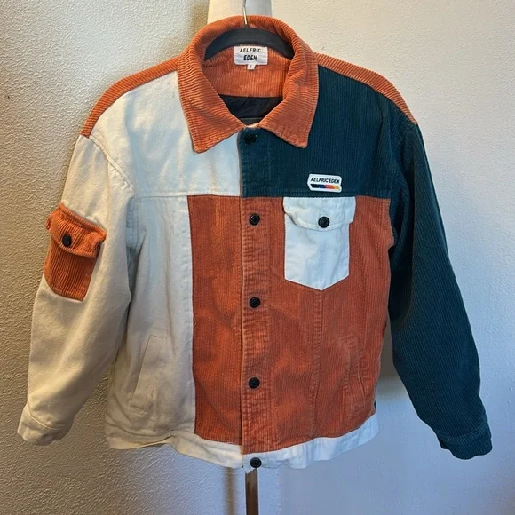 Stylish orange corduroy jacket by Aelfric Eden. Perfect for a trendy look.**Hassome stains please see all photos before purchase Size SBundle and Save Offers are always welcomed Smoke free HomeAelfric Eden Jacket Aelfric Eden Color PatchworkVintage BomberClassic Aelfric Eden Jacketcolor block. Off white with orange and green. style tags : Streetwear ; skateboard