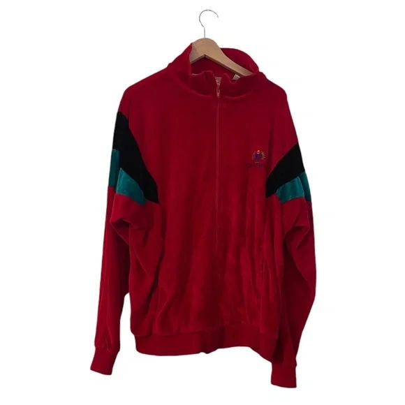 Full Zip Vintage CUC CINI Color-Block Velour Member Unisex Sport Jacket Red Multi Size XL1970s warm-up sweat jacketIn Great Condition Pet And Smoke Free HomeApprox. Measurements: Bust taken underarm to underarm at 28"Length taken top of shoulder to bottom hem at 29"Sleeve length taken underarm to sleeve end at 22"Across back shoulders seam to seam at 27" XMAS