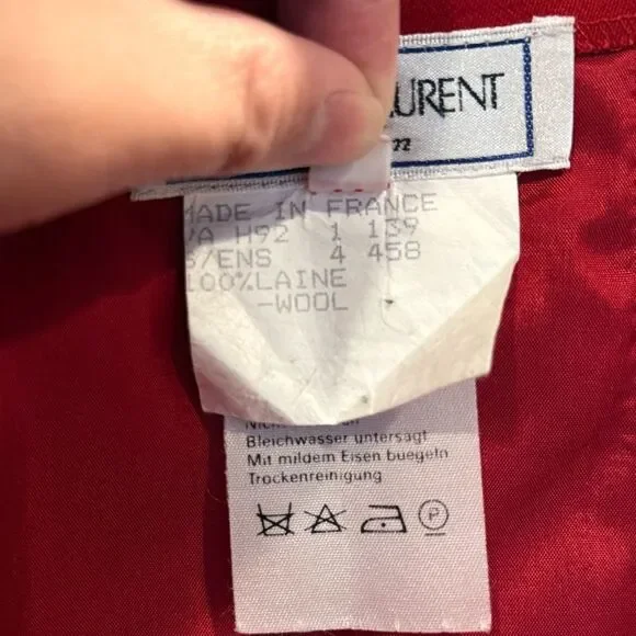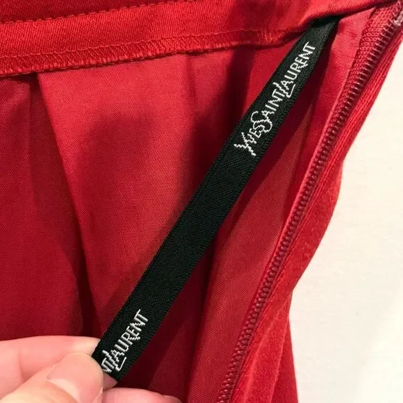 Yves Saint Laurent Women's US XL Vintage Red Wool Pencil Skirt - Rare 80s/90sMeasurements:Length: 24.5"Waist: 15.5" (laid flat, end to end)Material:100% WoolCondition:Pre-owned: good condition with a few minor flaws (see details below).Features:Button and zip closure on the left side for a secure fitSingle vent at the back hem for ease of movementMade in France, highlighting exceptional craftsmanshipVibrant red wool in a classic pencil skirt silhouette, perfect for vintage collectors or timeless fashion loversNote:This rare vintage skirt from Yves Saint Laurent has two barely noticeable flaws:A small run in the fabric at the waistbandA minor run in the fabric on the back near the bottom ventThese imperfections do not detract from the skirt's overall quality, wearability, or aesthetic appeal.Disclaimer: Please review all photos and the description carefully before purchasing. Pre-owned/used items are sold as is, meaning they may have flaws and show signs of wear. Colors may vary slightly due to display settings and lighting. All items are stored in a smoke-free, odor-free, and pet-free home. Photos are taken of items and packaging for insurance and quality assurance purposes during packaging and shipping.All sales are final. Returns are not accepted for buyer’s remorse or sizing issues. By purchasing, you confirm that you have read and agree to these terms.