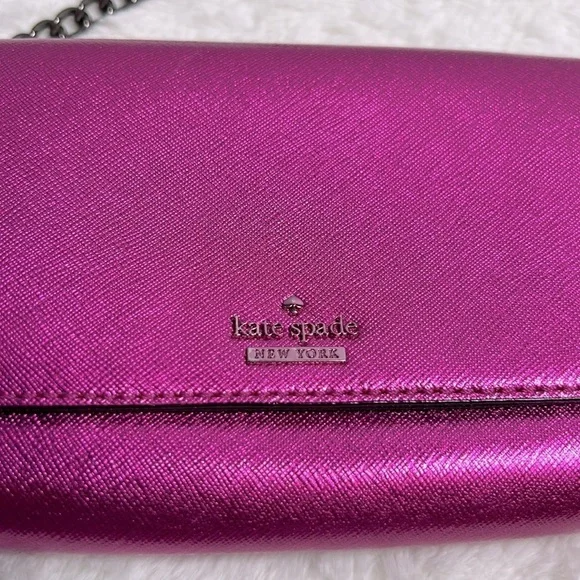 Barbie Sparkly Pink Crossbody Bag!This bag is in like new condition with the only sign of wear being a small stain on the inside bottom of the bag, completely out of sight.Please see last picture.Pink Metallic with Kate Spade branding on frontBlack and white interior with one slip pocketsnap closureChain and leather strapApproximate measurements:Length:6.5 inchesHeight:5 inchesWidth:1 inchStrap drop:21.5 inchesSmoke/Pet free Ref 031110Barbie/fun/party/sassy/hot pink/designer/fun/pop/