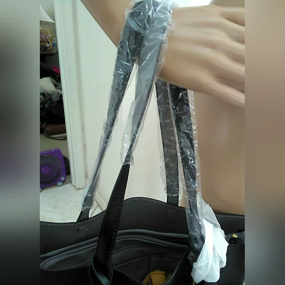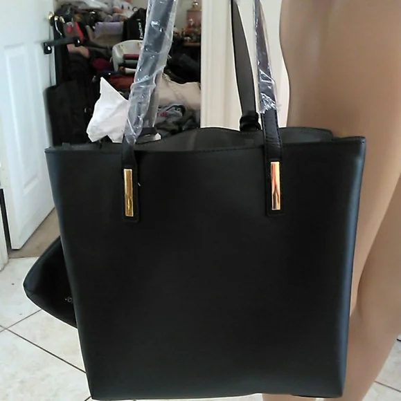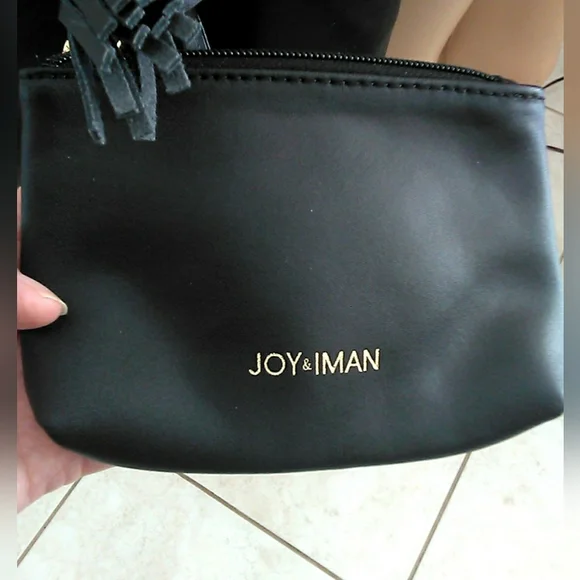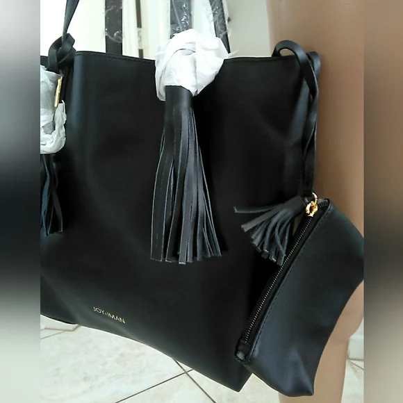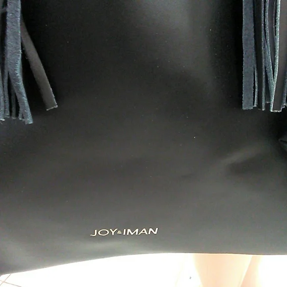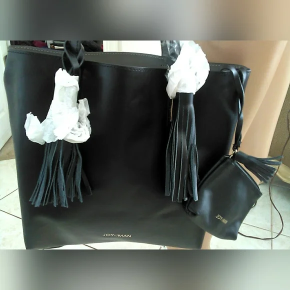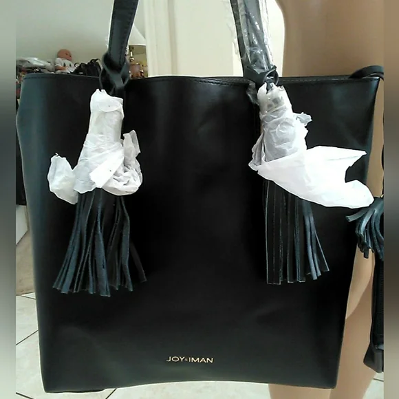 THIS IS BRAND NEW WITH ALL ITS PLASTIC, BUT THE TAG IS GONE. JUST WANTED TO EMPHASIZE THAT IT IS BRAND NEW .Stylish and versatile, the Joy And Iman black tote bag is perfect for any occasion. Its sleek design and spacious interior make it a must-have accessory. THIS BAG IS ALL LEATHER, PURE GORGEOUS LEATHER. IT COMES WITH THE EXTRA WRISTLET OR LITTLE BAG. LOOK AT THE LEATHER TASSELS, GORGEOUS. YOU CAN USE IT LIKE AN ALL OPEN BUCKET INSIDE OR USE THE SNAP ON AND REMOVABLE INNER BAG WITH POCKETS AND ZIPPERS WHICH WILL GIVE YOU SEPARATE COMPARTMENTS. ITS IS WASHABLE...YAYYY. THESE BAGS ARE PHENOMENAL AND DO NOT GET THE RECOGNITION THEY DESERVE. 12 X 13 X 4 APPROXIMATELY