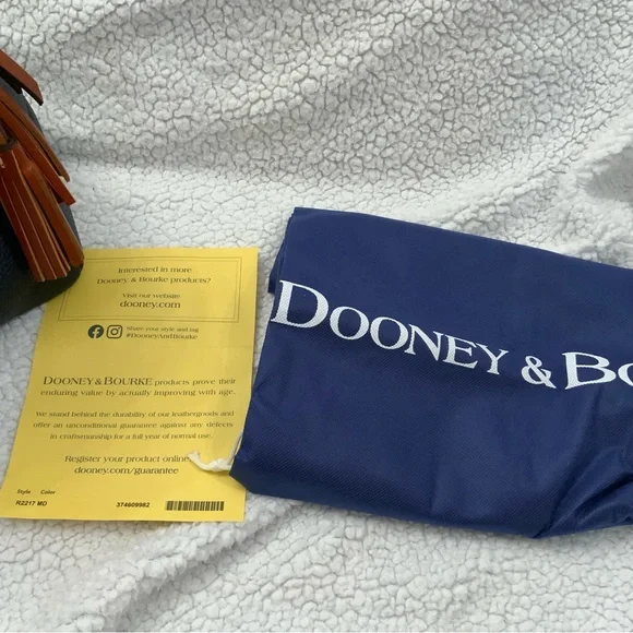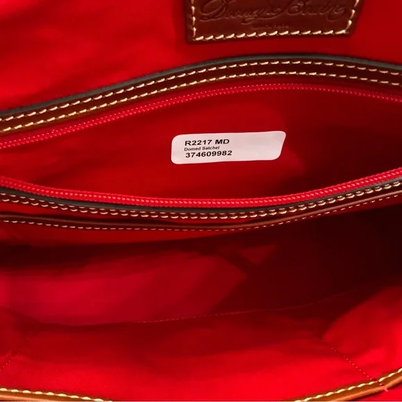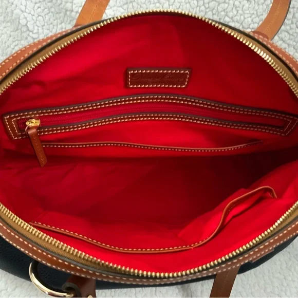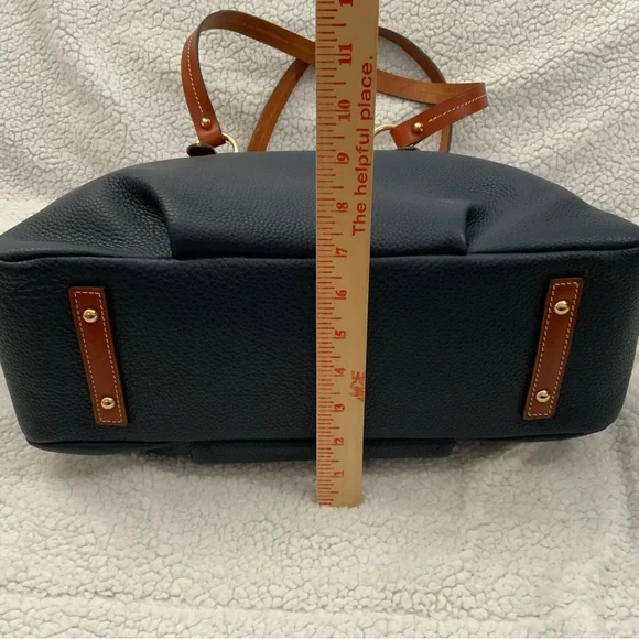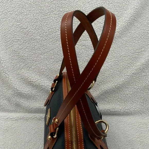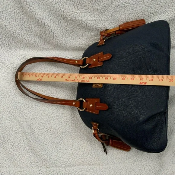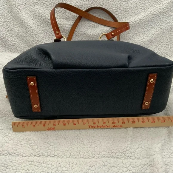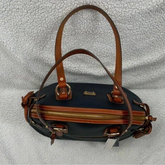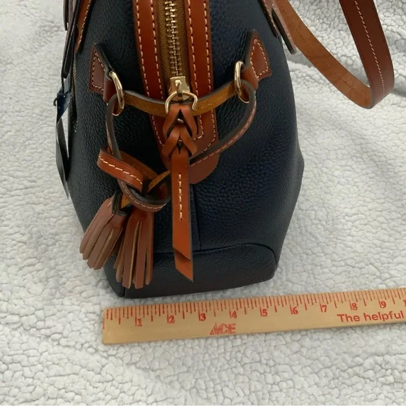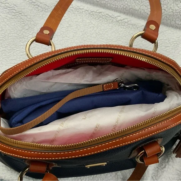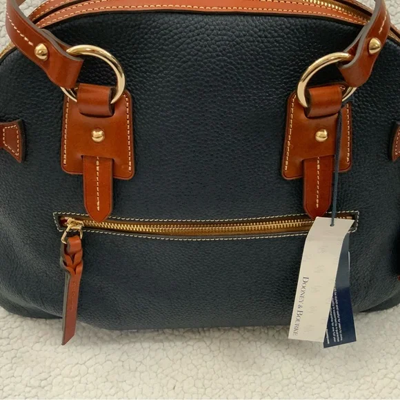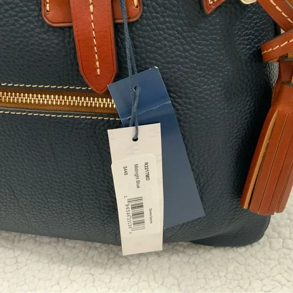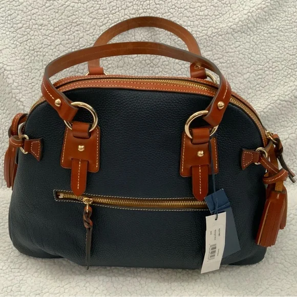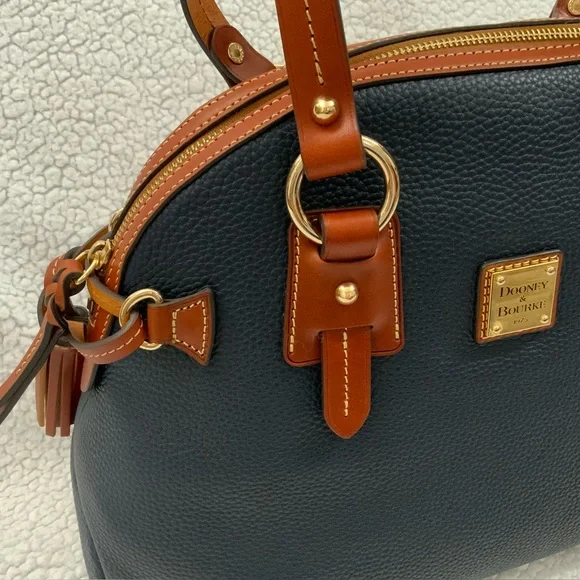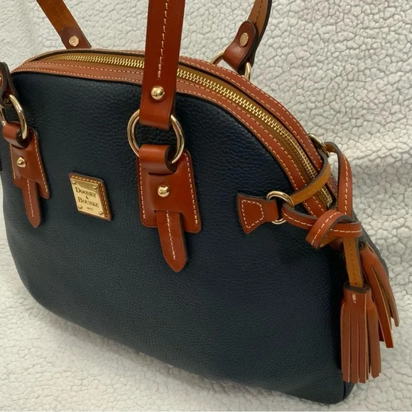 Dooney & Bourke Pebble Grain Midnight Blue Leather Domed Satchel New W/Tags $448Ours is a smoke free home *See photos for approximate measurements and fabric content Purchased at a major department store1st quality1360Material : Genuine pebble grain leatherTop zip closureDual leather straps with 9.5 " strap.drop1 exterior back pocketDecorative side leather hasslesBottom metal feetRed canvas lined interior1 interior zip pocket and 2 slip pockets, cell phone pocket and key hookDimensions: 10.5" H x 15" W x 5" DColor: Midnight BlueOriginal dust bagThe Dooney & Bourke Pebble Grain Midnight Blue Leather Domed Satchel is a stylish and versatile handbag perfect for travel, casual outings, and business meetings. Made from high-quality leather with a pebbled finish, this large satchel features a dome shape and comes with tassel accents. The brown double handles and gold hardware add a touch of sophistication to the bag, while the lined interior with inner and outer pockets provides functionality. Ideal for women looking for a chic and practical satchel/top handle bag from a reputable brand like Dooney & Bourke.