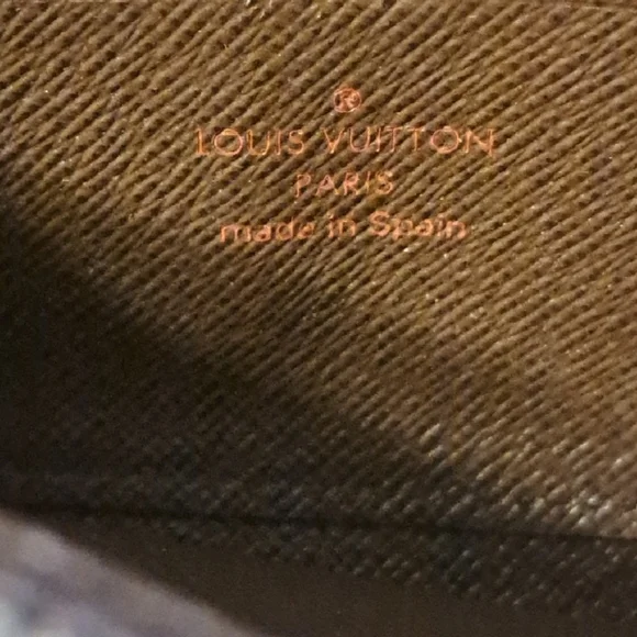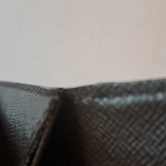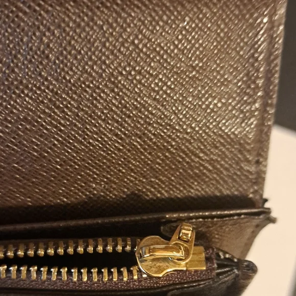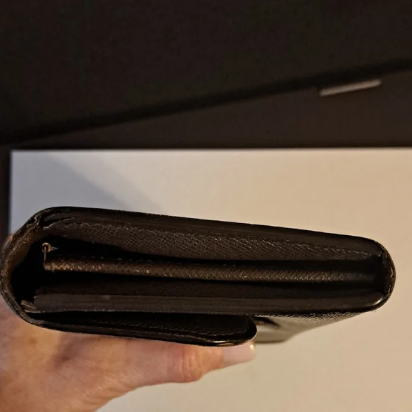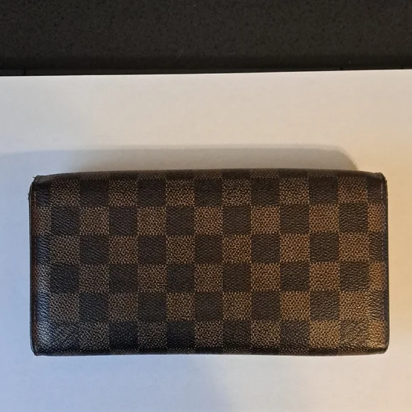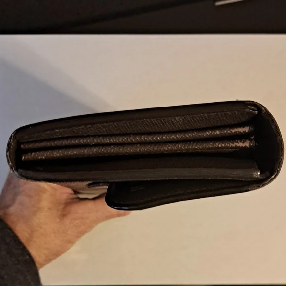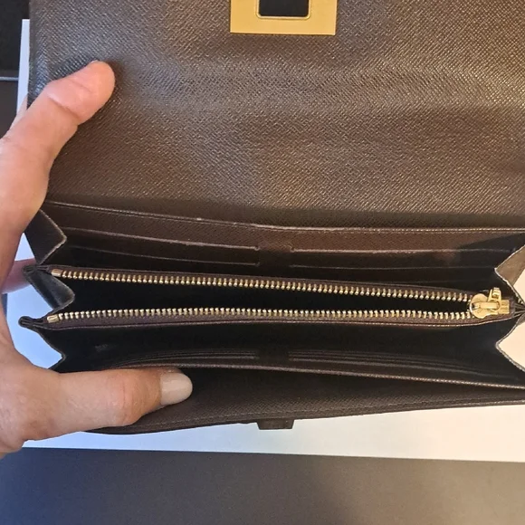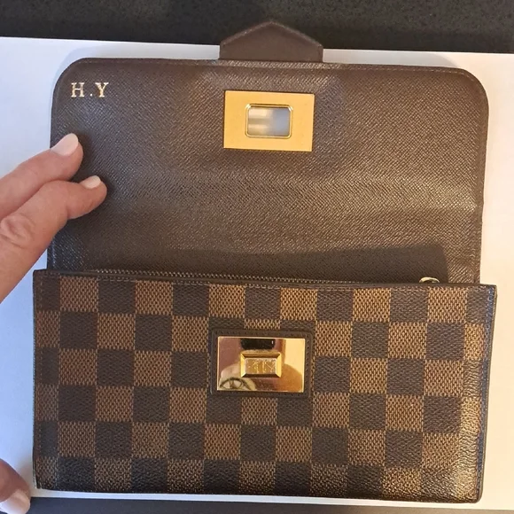 Stylish checkered clutch with gold-tone clasp. Ideal for chic outings.used but in good condition some scratches on Hardware initials HY imprinted under cover which can be removed 16 credit card slots 2 cash slots and 1 zippered pouch.only call out is the top cash slot has 2 threads loose on the right.zipper works well