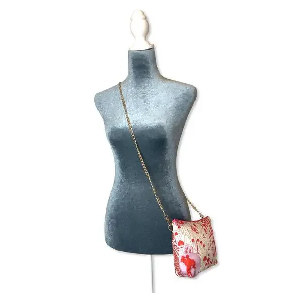 Vintage finds exclusively ours.Our vintage Hermès scarf crossbody bags are sustainably sourced, locally made with a history and story to be told. Reimagined from the world’s finest collection of vintage Hermès scarves, our crossbody bag is the ultimate accessory for your on-the-go lifestyle.Limited editions, perfectly sized to stash all your essentials in a zippered bag with a gold-tone removable crossbody chain. Dimensions8"H x 7"W x 2"DScarf Designed ByMaurice Tranchant for HermèsYear of Introduction1951ColorRed WhiteMaterialsVintage Hermes Nouveaux Amoureux de Paris silk scarf front paired with coordinating embroidered reverse. Fully lined, zippered closure with removable 23" drop gold-tone crossbody chain.Non-Affilitation Trademark DisclaimerExclusively ours, all items are sourced and altered from independently authenticated secondary market sources to preserve their beauty while reducing waste and its impact on the planet.All product and company names are trademarks ™ or registered® trademarks of their respective owners. Their use does not imply affiliation or endorsement by these companies.Shipping ReturnsFree US Ground ShippingCountry of OriginHandmade in the USA from vintage imported materials