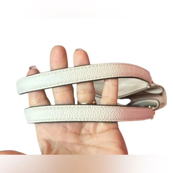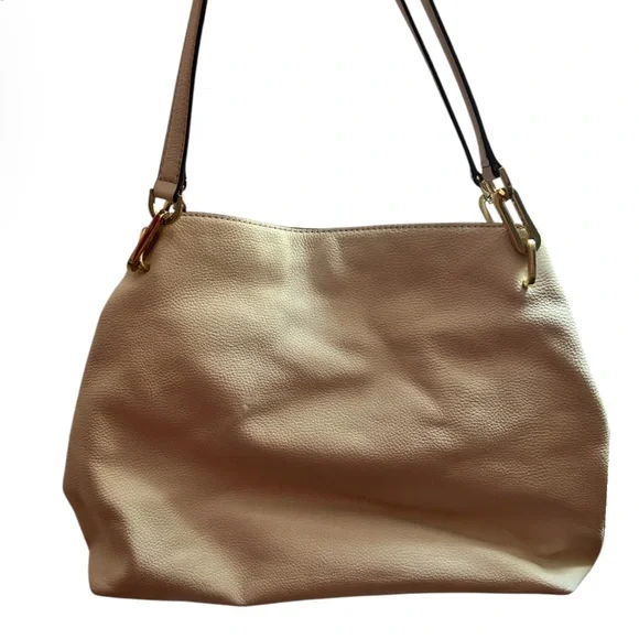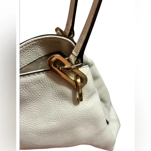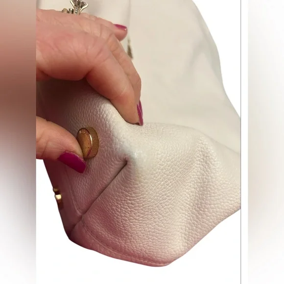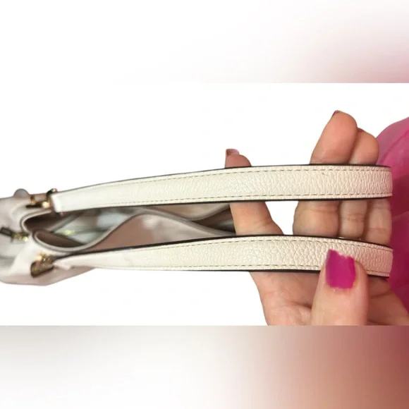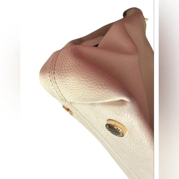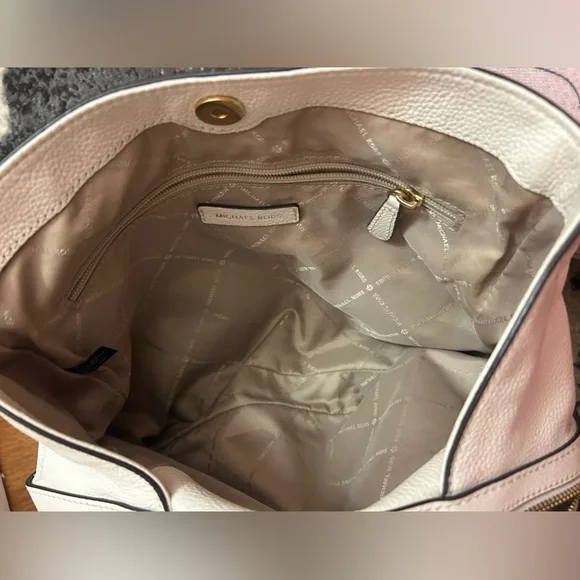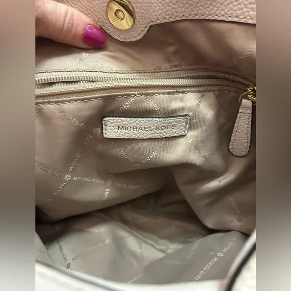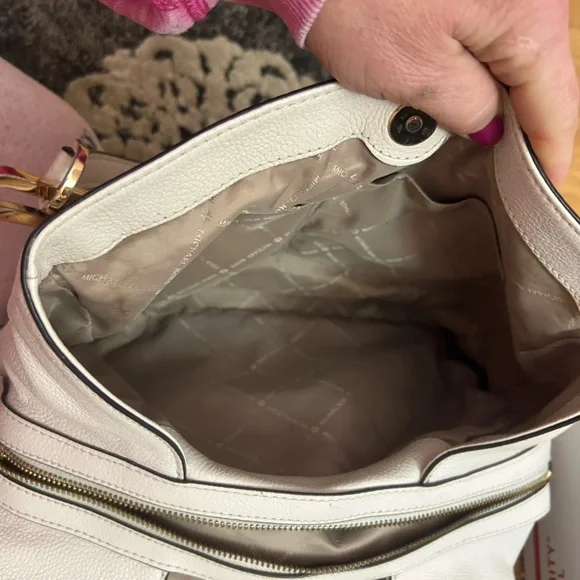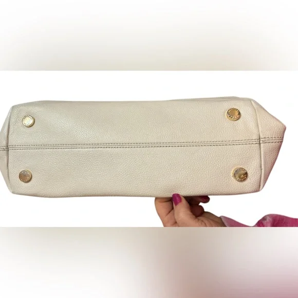 With a timeless, relaxed silhouette that boasts plenty of room for your essentials, the Kensington tote bag is our pick for everyday elegance. It’s crafted from pebbled leather and detailed with polished-looking gold-tone hardware. The top handle slips comfortably over the shoulder, while the center zip compartment is perfect for keeping your wallet and phone secure. Two side pockets close with magnetic snap closures.The interior is CLEAN. No stains, rips or smells.The drop handles have NO flawsThe gold hardware is very pretty.There is minor tarnish on the bottom gold feet. • 100% leather from tanneries meeting the highest standards of environmental performance• 12.5”W X 10.25”H X 5.5”D• Handle drop: 10.5”• Exterior details: back slip pocket• Interior details: 2 back slip pockets, center zip compartment, front zip pocket• Lining: 100% polyesterThis bag is a creamy off white/ pearl color. The photo that is featuring the gold hardware best reflects the bags color.Perfect for spring and summerThere is VERY mild color fade on the corners - almost unnoticeable Retail is $358.00 currently on the MK website in black