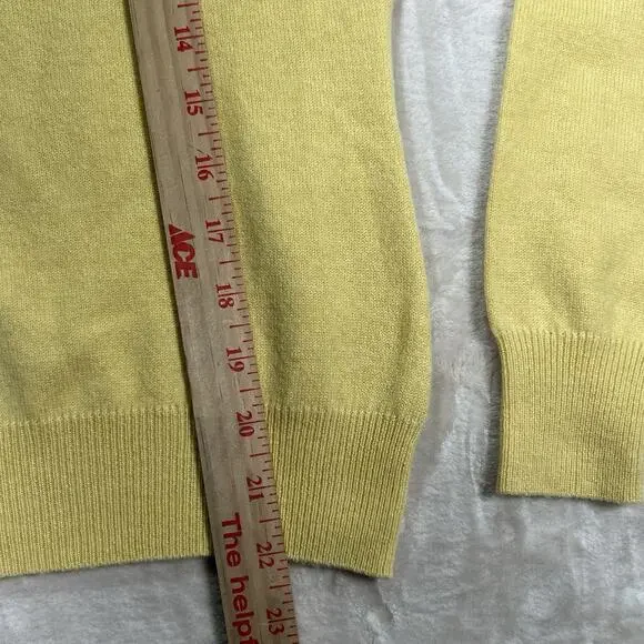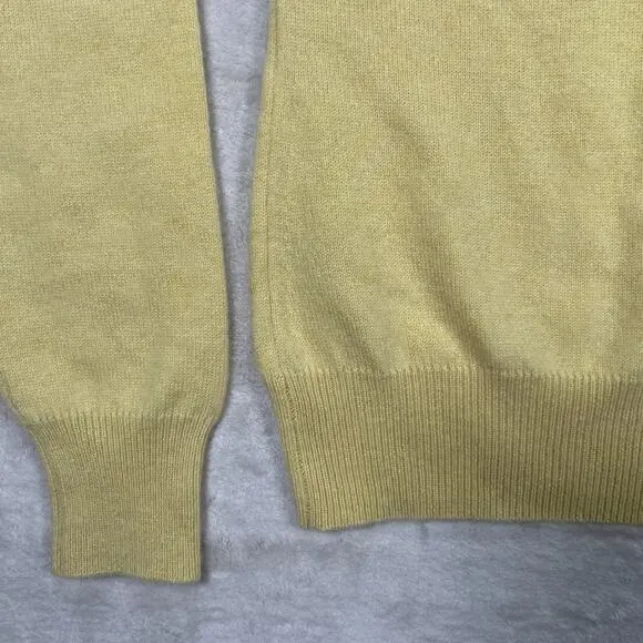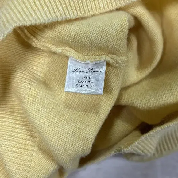 This is a Loro Piana sweater for women in size IT 40 (US Small) in a solid yellow color. Made of 100% cashmere with a tight-knit fabric, it features a V-neckline and long sleeves. This designer piece exudes Italian minimalist style and quiet luxury, perfect for casual, business, or travel occasions. Crafted in Italy, it is lightweight, collarless, and offers a regular fit.Sweater in great conditionMissing the main brand tag - size tag and inner fabric tag still on sweater