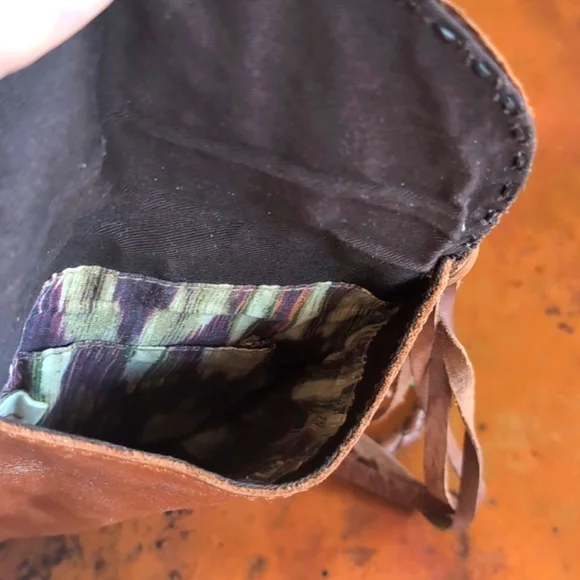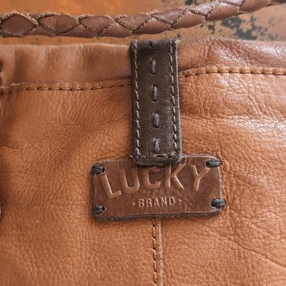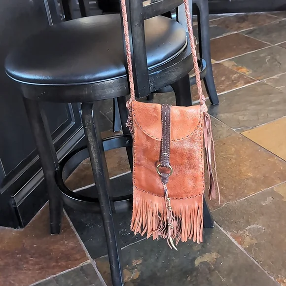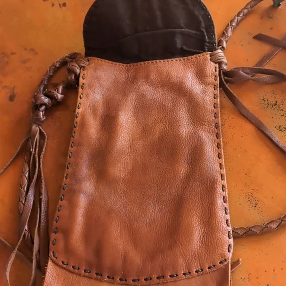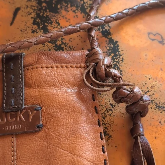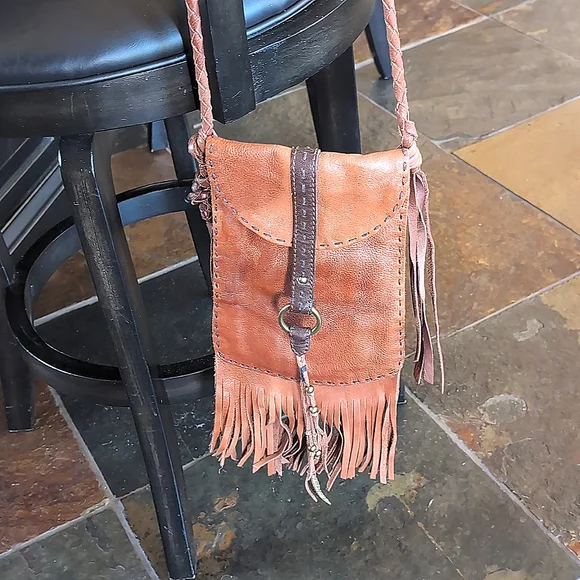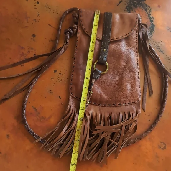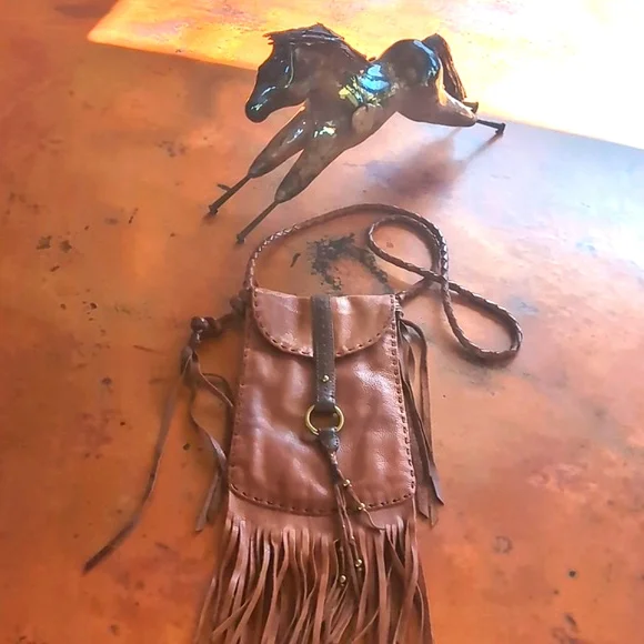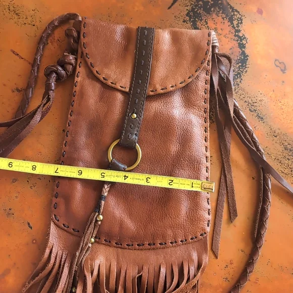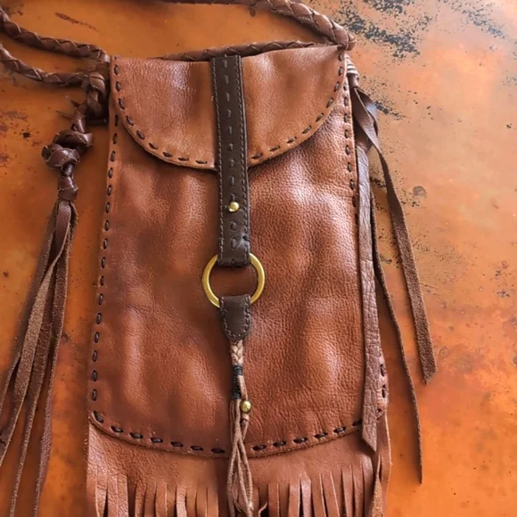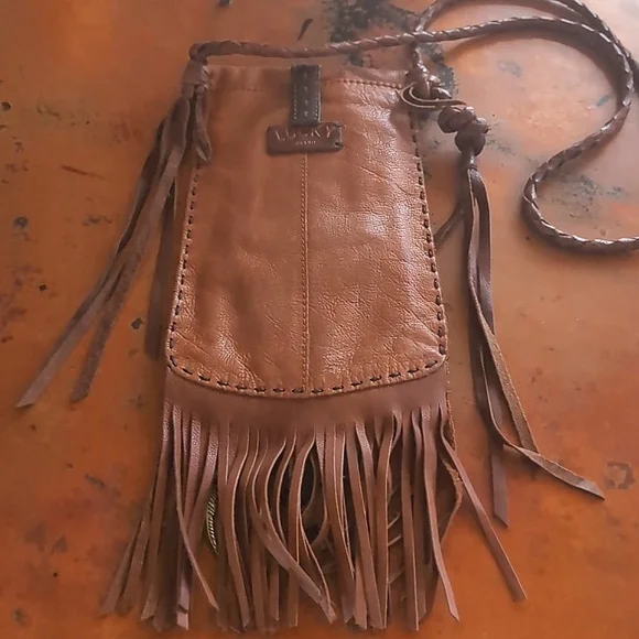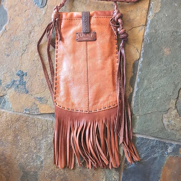 Super RARE Vintage Lucky Brand Wild West fringed crossbody bag marbled tanned leather brown with brown stitching has a handcrafted lookReminds me of a vintage medicine bag!One slip pocket inside Fabric liningsee photos for measurements beautiful leather braided strap with knots And leather Fringe.brass ring Hardware flap closure with brass beads and brass feather motif Great minimalist bag with a leather Fringe statement!Boho/Western🐎