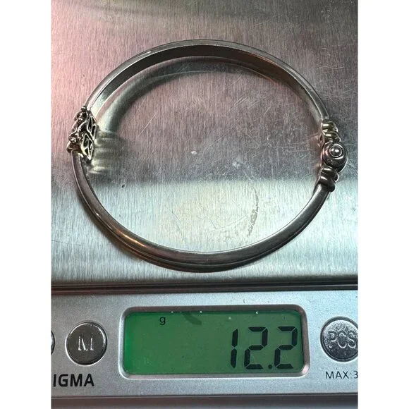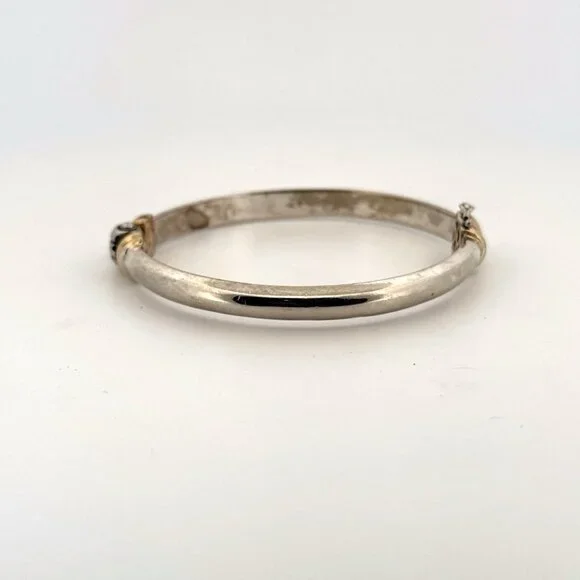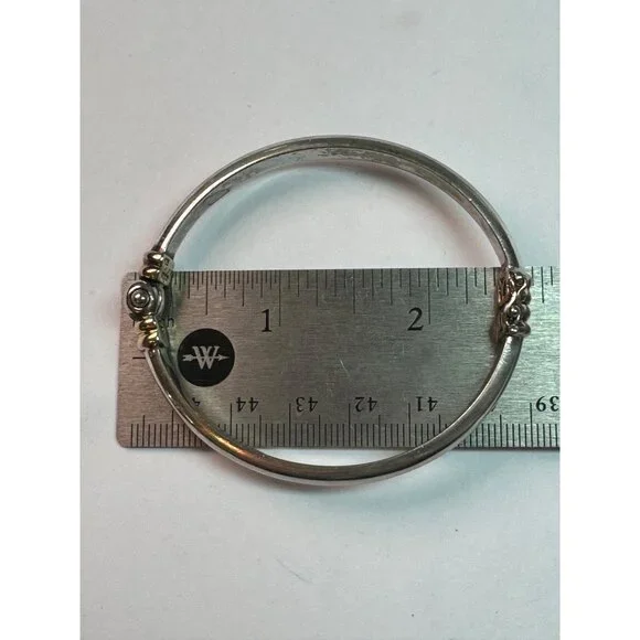 Vintage Designer Sterling Silver 2-Tone Hinged Bangle Bracelet with Safety Clasp, Made in Thailand, 6.5" Length, 12.2 gramsItem Description:This exquisite vintage designer bangle bracelet is a true statement piece, crafted from high-quality sterling silver and featuring an elegant two-tone design. Made in Thailand, this bracelet boasts intricate detailing and a secure hinged safety clasp for ease of wear. Measuring 6.5 inches in length and weighing 12.2 grams, it offers a perfect balance of sophistication and comfort. Ideal for any jewelry collection, this piece is a must-have for those who appreciate timeless elegance and superior craftsmanship. Perfect for special occasions or everyday wear, this sterling silver bangle is a testament to vintage estate jewelry's enduring charm.Features:• Sterling Silver 2-Tone Hinged Bangle Bracelet with Safety ClaspSize: Womens 6.5" LengthCondition: Pre-Owned Great Preowned COndition