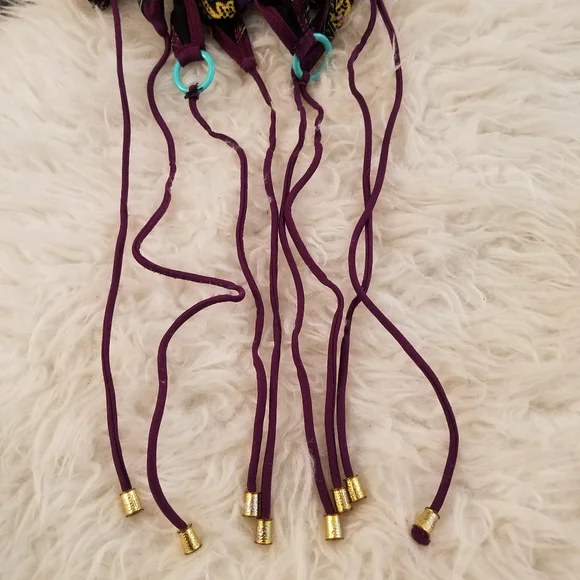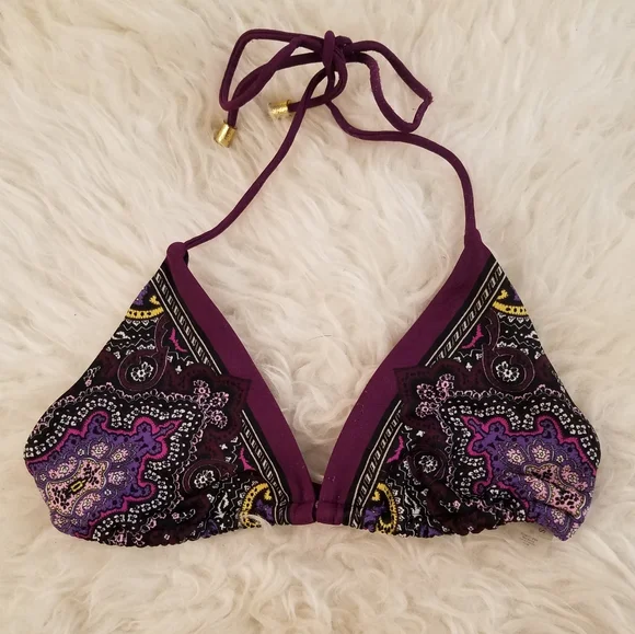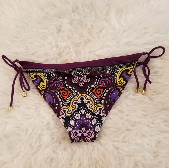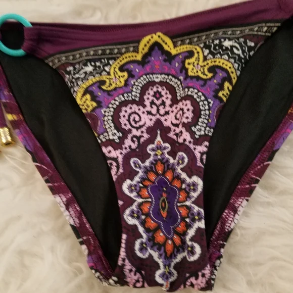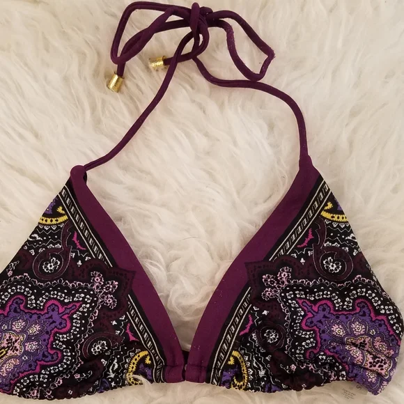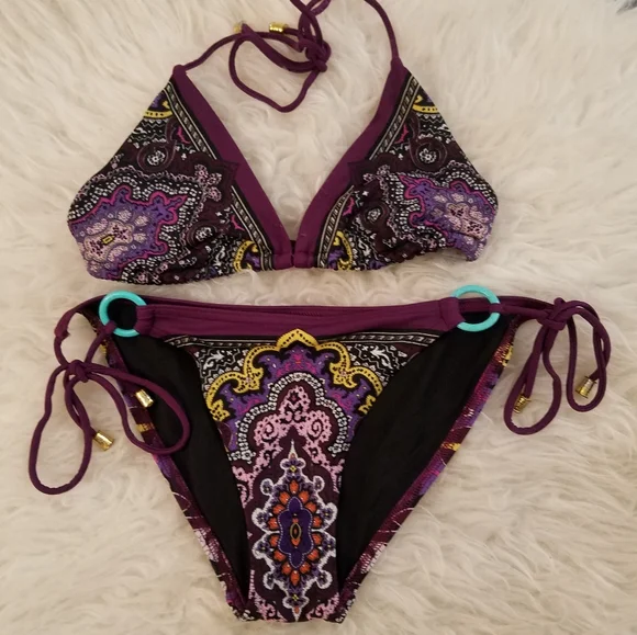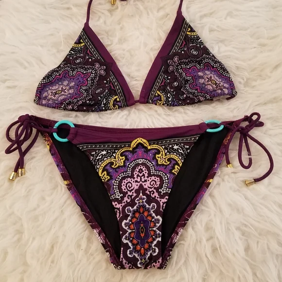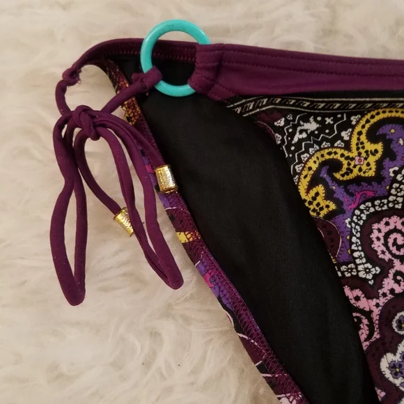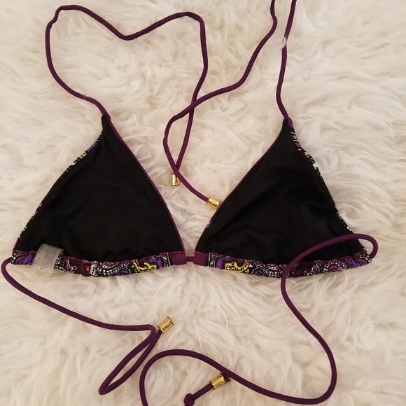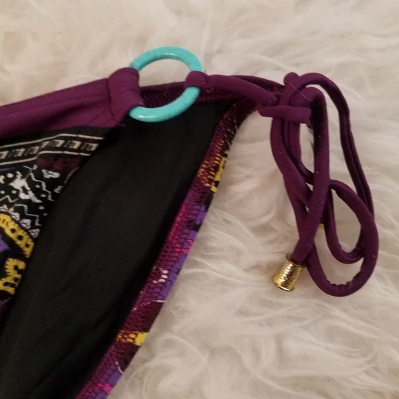 Bohemian purple string bikiniSTOCK PHOTOS HAVE AN ADDITIONAL CHARM DANGLING THE BOTTOM, IT DOES NOT COME WITH THE CHARM⚠️👙STOCK PHOTO IS FOR VS REFERENCE ON FIT ONLY!👙⚠️■Used: Strings are twisted from being double knotted, slight pilling around the cups and waist band: please see photos■TOP MEDIUM (unpadded)BOTTOM SMALL*Please ask all questions and look at all photos prior to purchase
