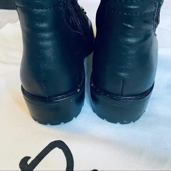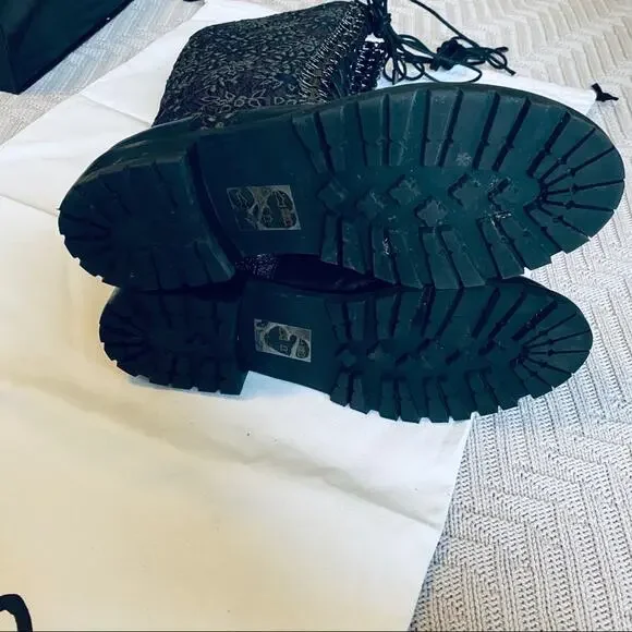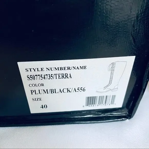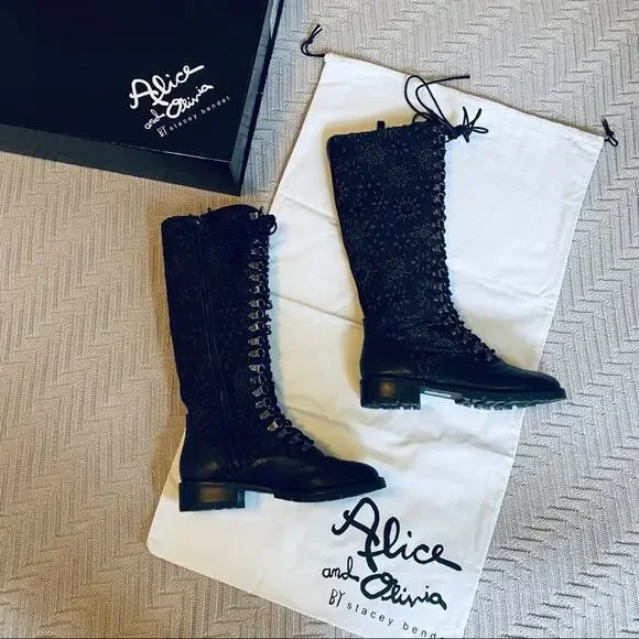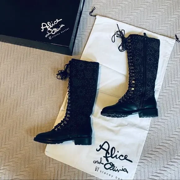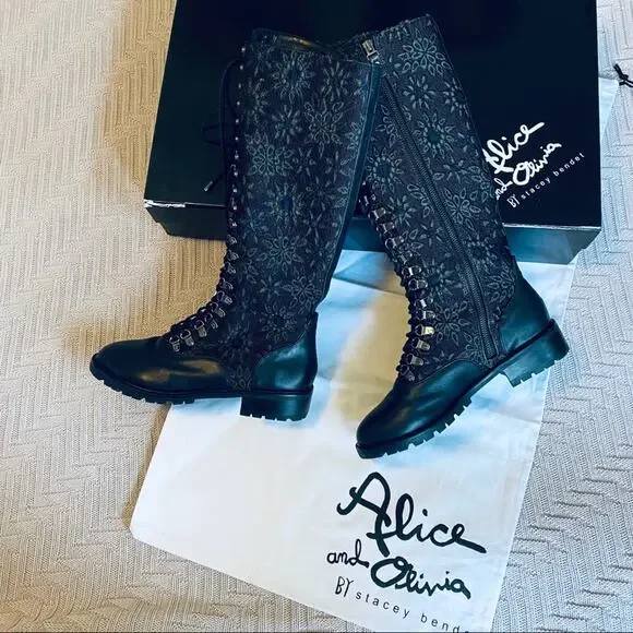 Alice + Olivia Terra leather and jacquard knee-high combat style boots, size 10. Previously loved but in like new condition, only worn a few times. Full side zipper, and adjustable laces on front to accommodate all calf sizes. Comes with original box and dust bag. Box does have tearing at crease. Great steampunk, punk, goth style boots. Non smoking and pet free house.Approx heel height: 1.5”Approx shaft height: 15”