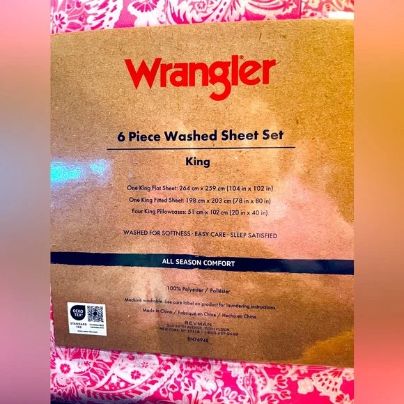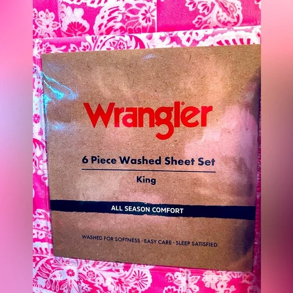 Wrangler• New With Tags• King Size Pink & White Bandanna Paisley 6 Piece Sheet Set & 2 Standard Pillow Cases• Sold as a Package• 100% Polyester Please Ask Questions• See Photos for Details• Clean and Smoke Free HomeSerious inquiries and offers only please 🌸Thanks for stopping by 😌Please share if you will 🤠