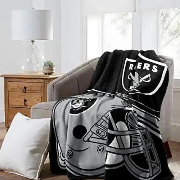 NEW NFL Las Vegas Raiders Raschel Throw Blanket, 60" x 80", SlantDescription : This is the softest, brightest, and plushest printed blanket on the planet! This luxurious throw can be used at the game, on a picnic, in the bedroom, or cuddle under it in the den while watching the game. These blankets are extra warm and have superior durability. They are easy to care for, and are machine washable and dryable. The throw blanket is made of acrylic and polyester, and is 60"x80" in size. Made By Northwest Company.Features a team helmet in the foreground and the team logo and name slanted in the backgroundSoft and warm raschel fabric; oversized; decorative binding around all edgesMeasures 60"W x 80"LMachine wash cold separately using delicate cycle and mild detergent. Do not bleach. Machine dry separately on gentle cycle. Remove promptly. Do not iron.Made of 100% Polyester.