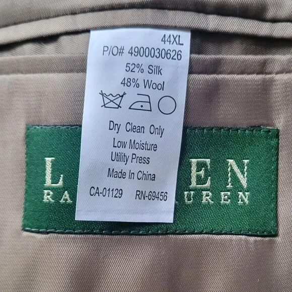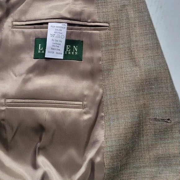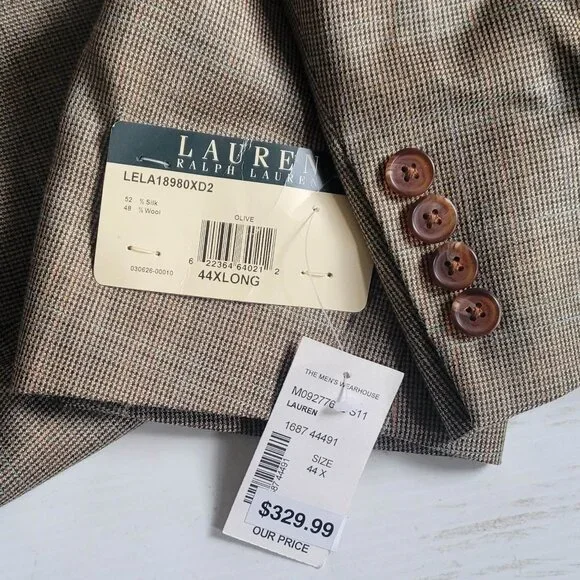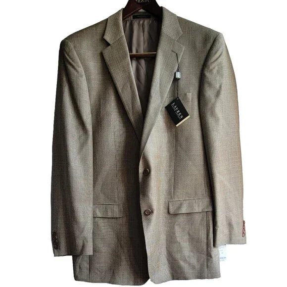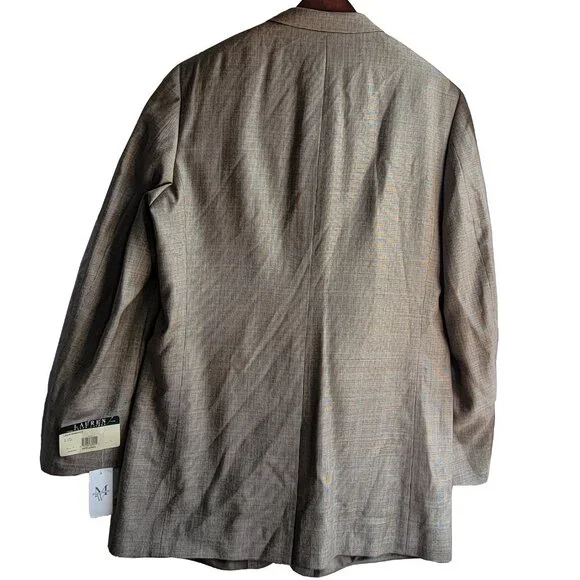 New with tags RALPH LAUREN Mens 2 Button Blazer(Silk Wool blend )Beautiful fabric of olive (greenish tan) with blue plaid /checks, 2 button front, 4 buttons sleeves, center vent.Size 44 X-long (extra - long) for big & extra tall guysApprox measurement:Shoulder to Shoulder width: 20.5 inSleeve Length: 27 inchest armpit to armpit: 47 inShoulder to Bottom length: 34 in