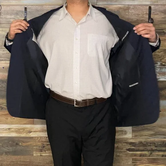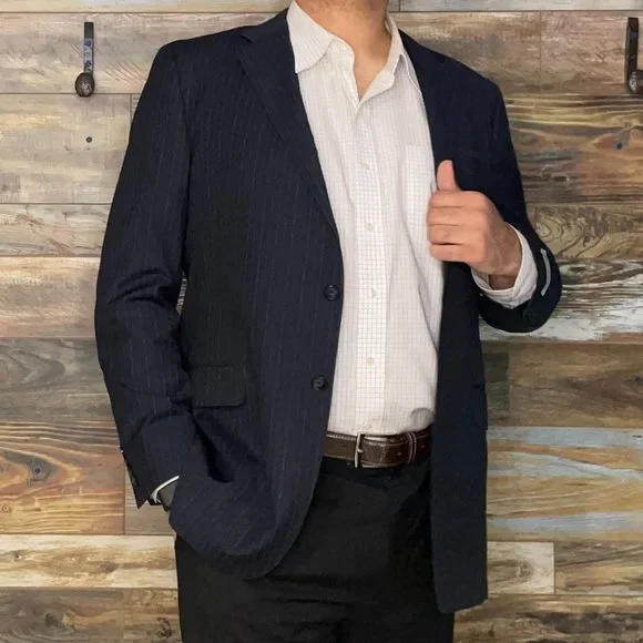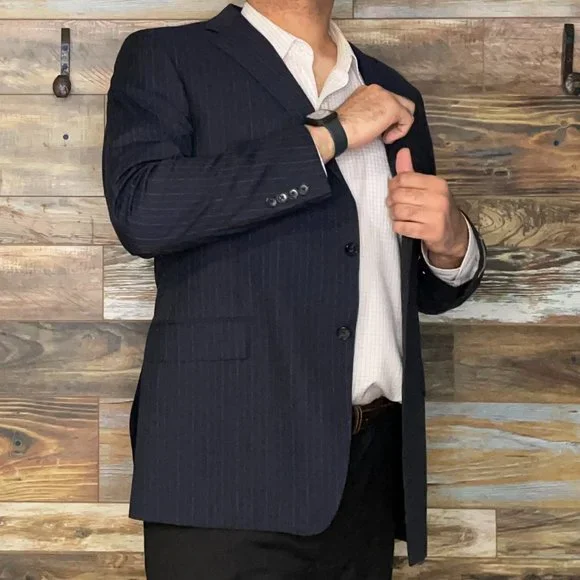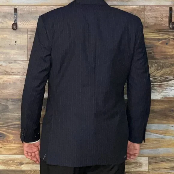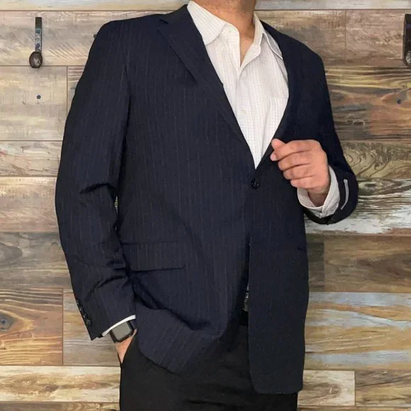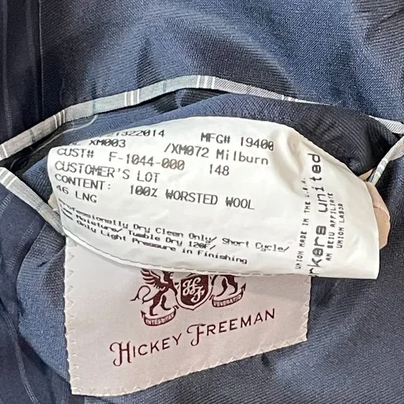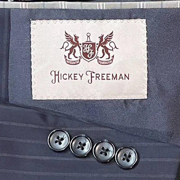 Hickey Freeman 100% Wool Navy Blue Striped Blazer Sport Jacket Size 46LExcellent ConditionDesigned & Made: CanadaSize: 46L Size Comments:General Comments: Excellent Condition, Please review the measurements provided below.- DetailsModel: 2-Button front closure, Double rear ventAppropriate to wear:Summer, Spring , Winter & FallFabric content: 100% Wool Color/Pattern: Navy Blue, StripedInterior pockets: 3Lining: fully-lined, Navy Blue satin- MeasurementsPit to Pit: 24"Shoulders at widest point: 19 1/2"Sleeve length from top of shoulder: 26 3/4"Length from bottom of collar: 32"