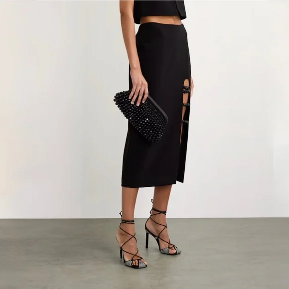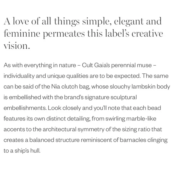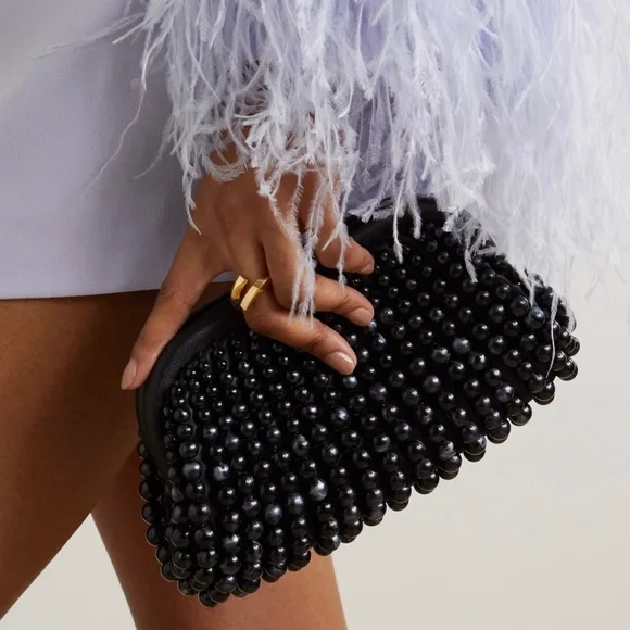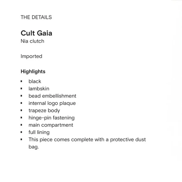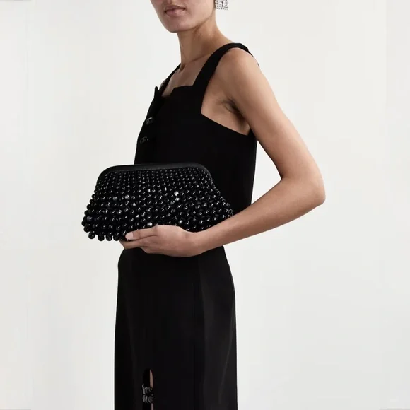 New with tags and dust bag Cult Gaia Nia beaded leather clutch constructed from butter-soft nappa leather, the Nia clutch is overlaid with clear beads that graduate in size. Each bead graduates in size and features it own unique detailing, from swirling marble like accents to the architectural symmetry of the sizing ratio that creates a balanced structure. A timeless, elegant true heirloom piece.*Magnetic fastening *100% lambskin leather #RR24112411020286540SKRAMEREES