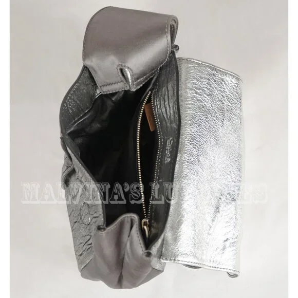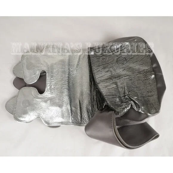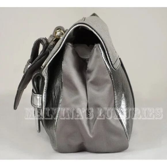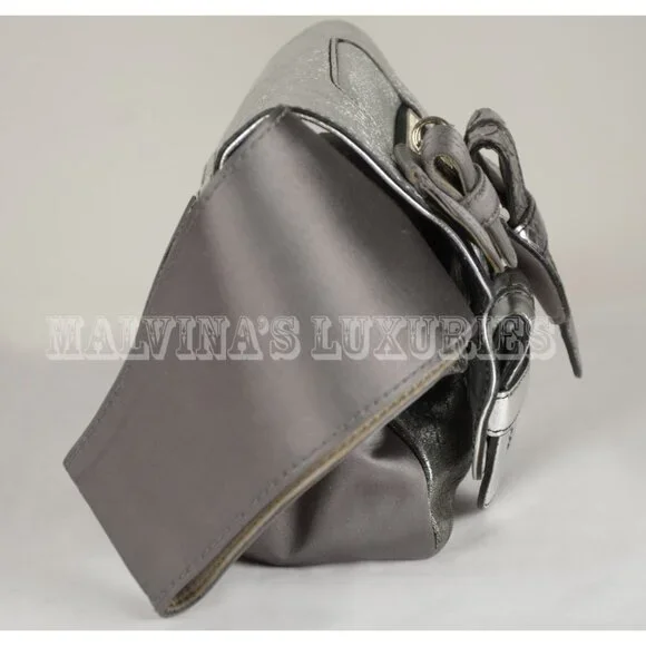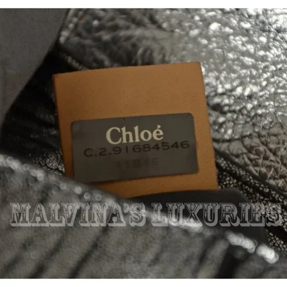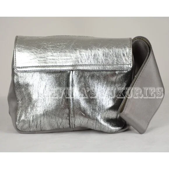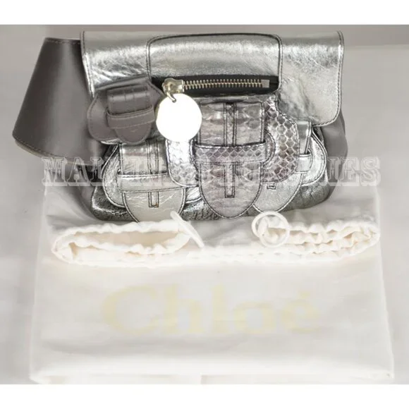 Designer: ChloeCondition: Authentic and Brand NewMaterial: Crinkled Leather, Satin DetailUnique Features: Silver Buckled Wristlet Handbag; Crinkled Leather with Wide Satin Wristlet Strap / Satin Sides and Bottom and Front Faux Buckles; Center Snakeskin Flap, Magnetic Closure, Interior Zippered PocketColor: Silver / Pewter with Gold hardware, Gray Wristlet Strap, please note that color appearance may vary depending on your monitor settingsMeasurements: 7.5" (19cm) x 8.3" (21cm) x 4"(10cm bottom)Malvina's Luxe (Malvina's Luxuries) is a trusted name in designer merchandise since 2001, we pride ourselves on offering authentic, brand new items that are carefully packaged and come from a smoke free environment. Our solid reputation on other platforms ensures that you can shop with confidence. Enjoy amazing deals on luxury items and join our community of satisfied customers!