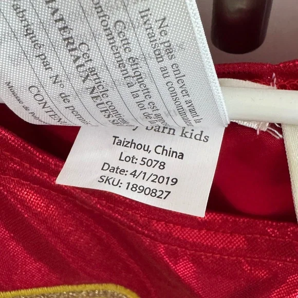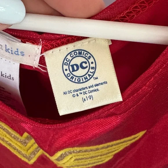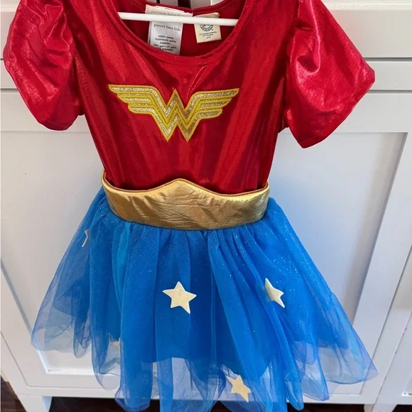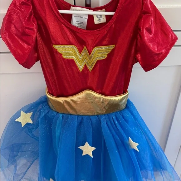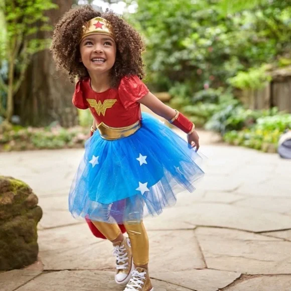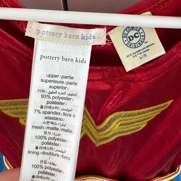 Unleash your inner hero with this Pottery Barn Kids costume, featuring a striking red top with puffed sleeves and a royal blue tulle tutu. The ensemble is completed with a metallic gold emblem and a matching headband, perfect for imaginative adventures.Only dress included (accessories not). Bundle to save.Help your child realize their inner warrior with this eye-catching Wonder Woman costume. It includes a one-piece dress donning a glittery iconic Wonder Woman logo on the metallic red top and sparkly dimensional stars on the shimmering tulle skirt. Metallic wrist cuffs and a plush metallic headband are the perfect finishing touches to this heroic costume.DETAILS THAT MATTERFour-piece design includes dress, headband and two wrist covers.The dress top is made from 64% rayon, 32% nylon and 4% spandex.The dress skirt is made of 100% polyester tulle which has white stars printed on the tulle and a gold belt that is sewn on.Wrist covers are made from red metallic polyester fabric and have Velcro closures.Headband is made of 100% polyester and has Velcro closure.Headband and wrist covers are filled with thin layer of polyurethane foam.Headband is one size fits all.Undergarments are not included.KEY PRODUCT POINTSSizes 3T, 4-6 years, 7-8 and 9-10 years.See size chart.Spot clean.Imported.© & ™2025 DC Comics.