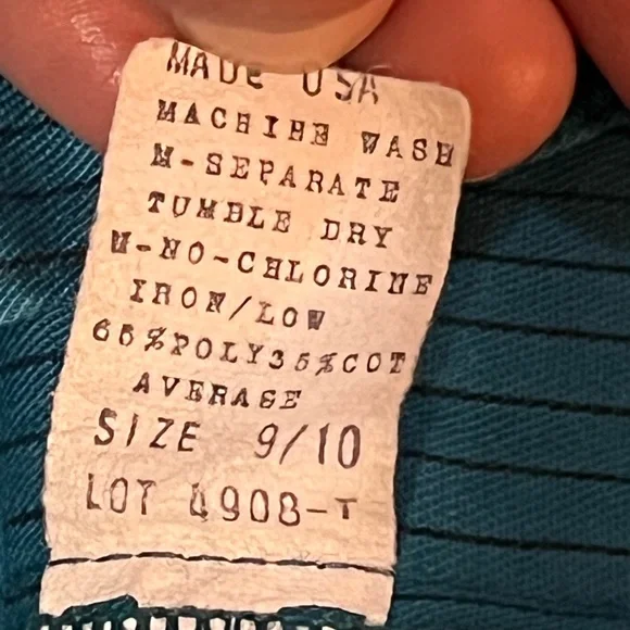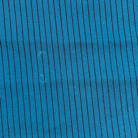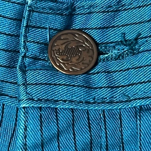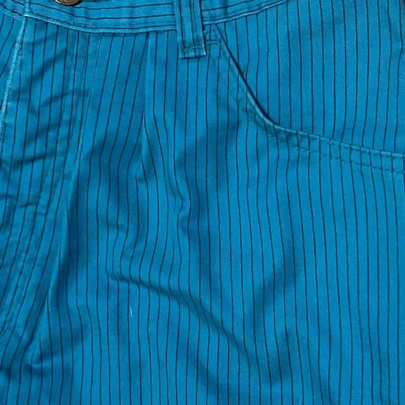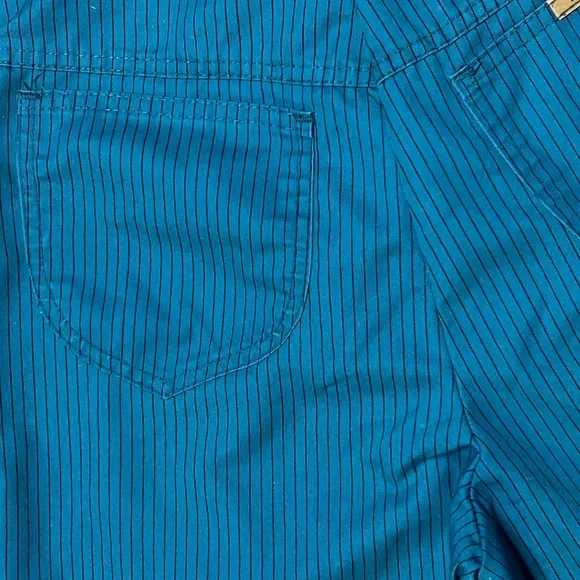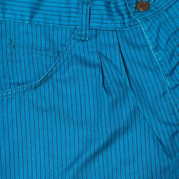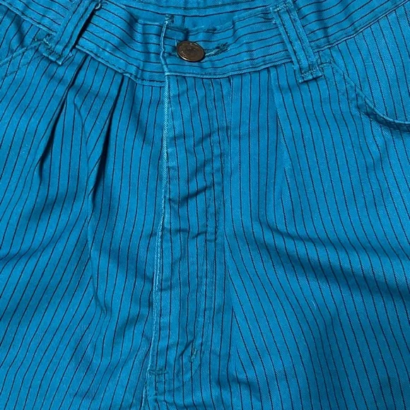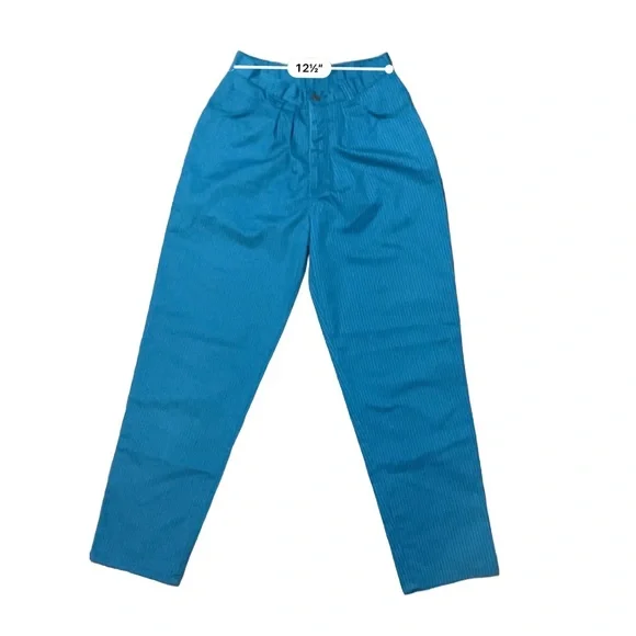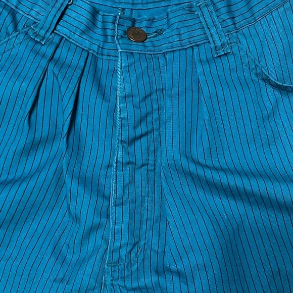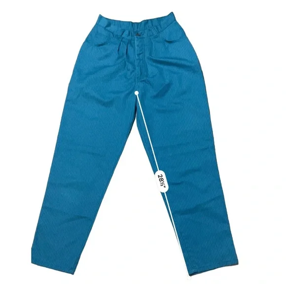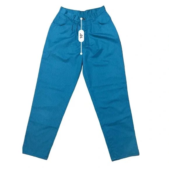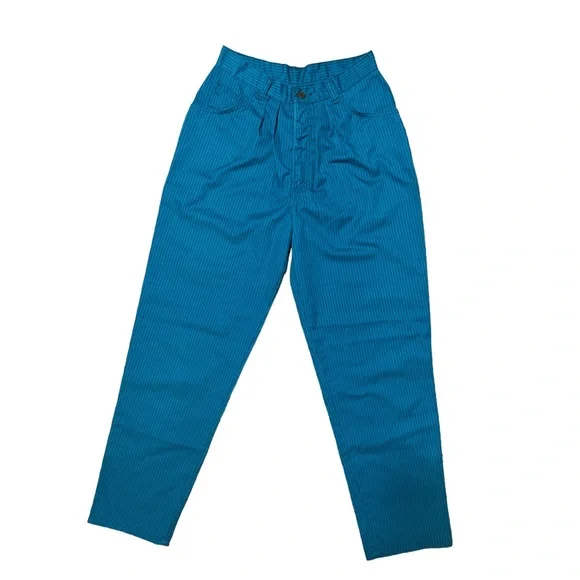 Elevate your wardrobe with these vintage Sweet Orr blue pinstripe pants that showcase a retro pleated style. Made in the United States, these mid-rise pants feature a slim fit with tapered legs and a front closure with both a zip and button. The pants come in size 9/10 with a waist size of 25 inches and an inseam of 28.5 inches.Perfect for casual wear or workwear, these pants are machine washable and made from a blend of polyester and cotton. The striped pattern and canvas like fabric type give off a classic USA theme, making these pants a must-have for those who love vintage clothing.In used condition with one faded spot shown closely in the photographs. No other noted flaws.(1887)