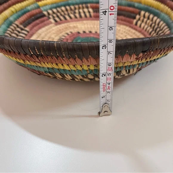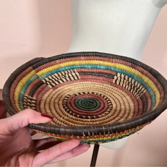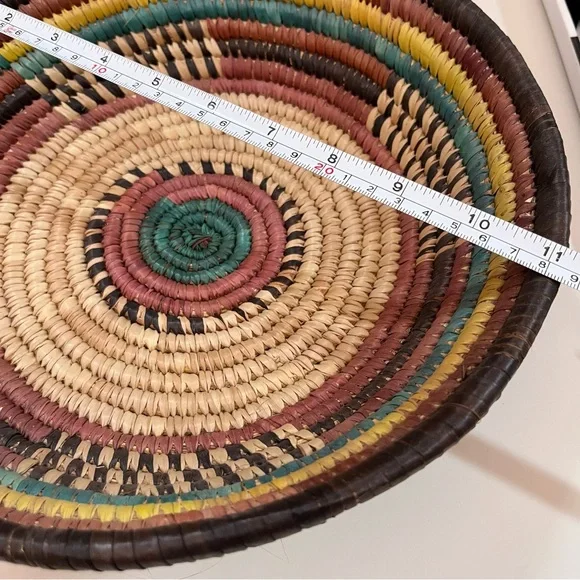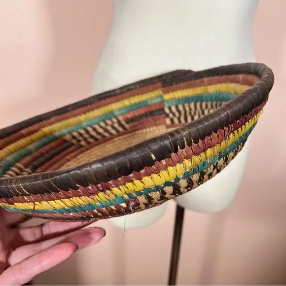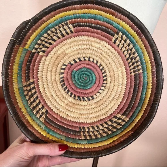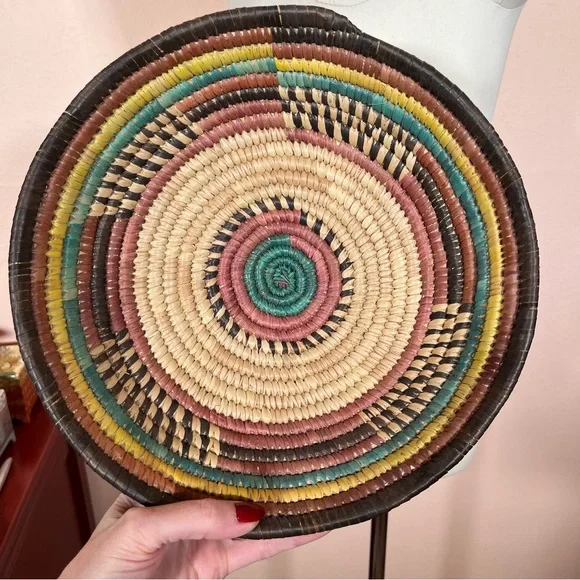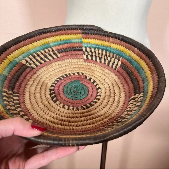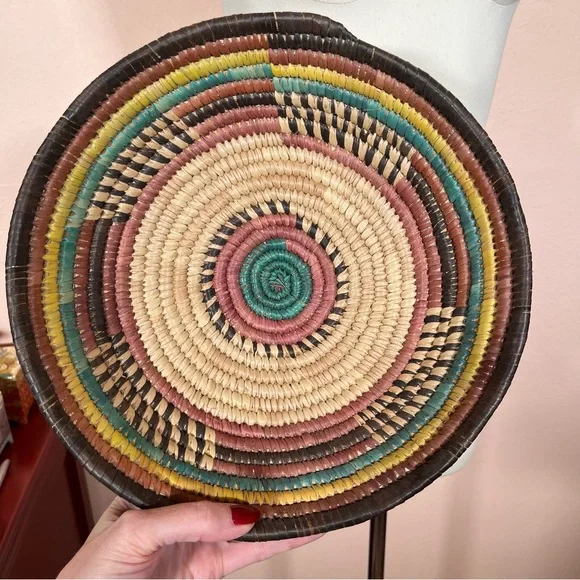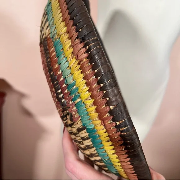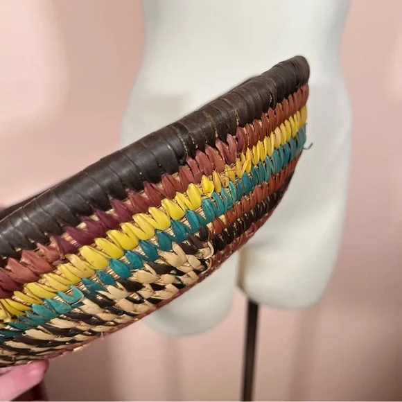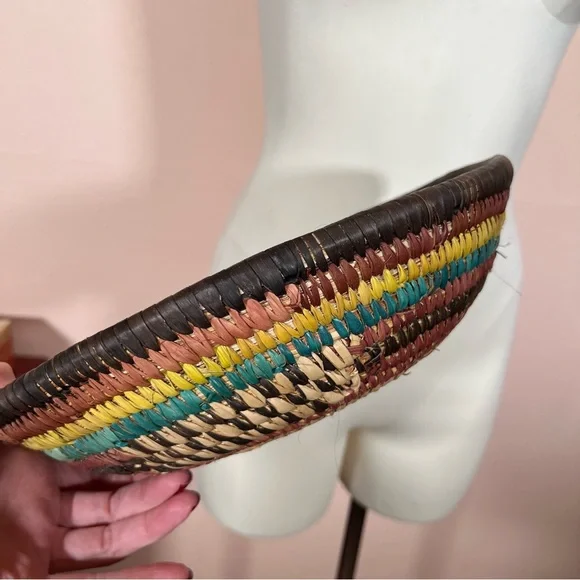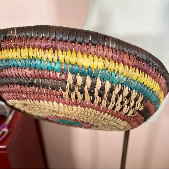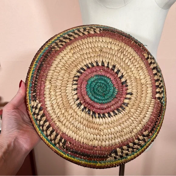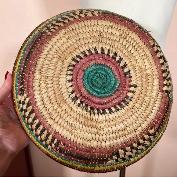 Vintage Bohemian Handmade Natural Straw Southwestern Colorful Round Thick BasketArtist made natural straw basket. Thick sturdy basket in a round shape with dyed straws in muted colors of coffee brown, purple burgundy, and teal turquoise and sunny yellow. perfect for a natural art accent of perfect for a function piece of art to hold fruit or bread. Southwestern style that is natural with a rustic vibe. Excellent Condition size approximately 11 inches in diameter 3 inches tallNeed More Specifics? Just Ask ♥️I am Happy to HelpOffers Welcome ♥️