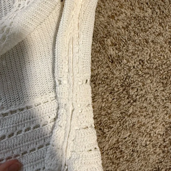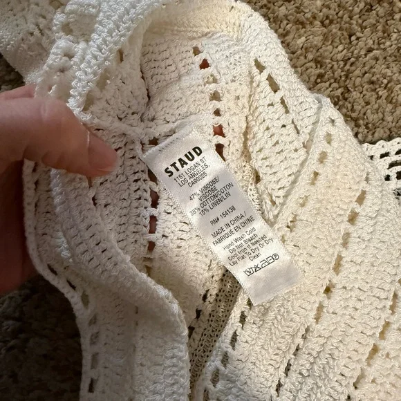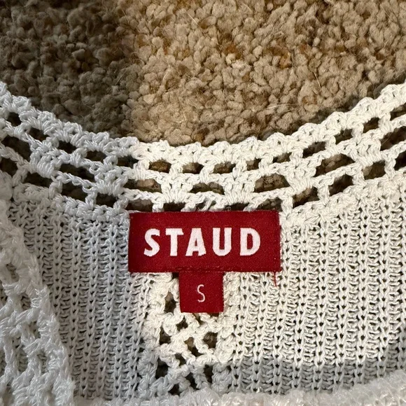 This cream blouse by STAUD features a fitted, ribbed design with cap sleeves and a cropped length along with a side zipper. The top is crafted with intricate vertical and horizontal eyelet detailing, adding a touch of elegance to its romantic style. Perfect for pairing with high-waisted bottoms, jeans, shorts, (or the maxi skirt I also have listed!), this top offers a chic and sophisticated look.It is in gorgeous condition, having only been worn twice.