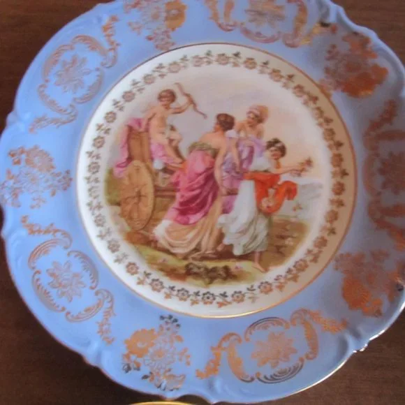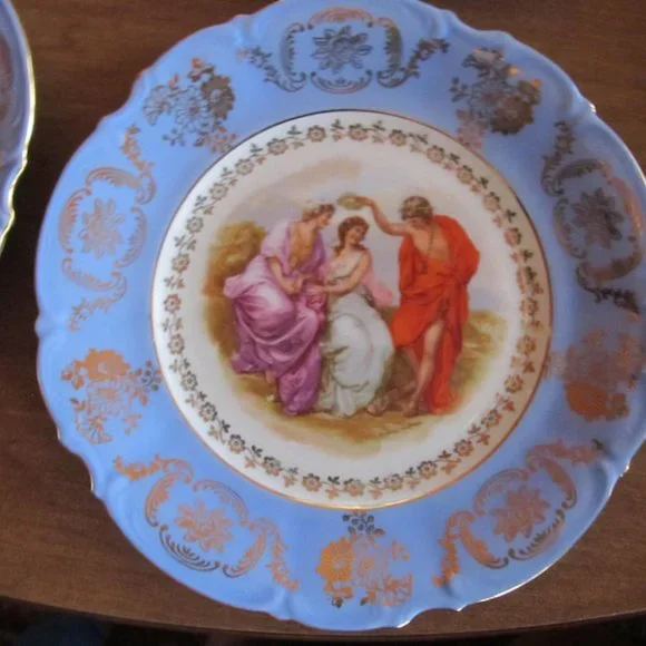 Beautiful Portrait Plates Ladies on Plates Portrait Plate Angelica Kaufmann Victorian Wall Decor CICO Germany Austria China Gold Encrusted Plate Cabinet plates Portrait Plates 22k Gold Plates Plates for walls Romantic home decor8" Diam Fine PorcelainBEAUTIFUL !!** SOLD Individually 2 different PatternsCHOICE:-The Crowning OR-The Wagonsigned Angelica Kaufmann on frontNo chips nor cracksComplimentary from, Porcelain Marks & More'CICO MADE IN GERMANY' above 'BAVARIA' addition, used as cover-up over previous makers marks roughly between 1946- 1955As one can see, this trading company either used stand-alone marks on otherwise unmarked items or applied ⇒cover-up marks to obscure original manufacturer marks. In both cases the items themselves are otherwise untouched, which clearly sinks the often mentioned 'decoration studio' theory.Manufacturer-marked porcelain items were provided by C. Schumann (Arzberg, Bavaria) and Heinrich & Co. (Selb, Bavaria), whilst the (otherwise unmarked) non-porcelain goods were provided by the manufacturers Schramberg or Schmider. Marks with the 'US Zone' addition were used between 1946 and 1949, all other marks were used between 1949 and 1955.Antique Cabinet PlateRL x