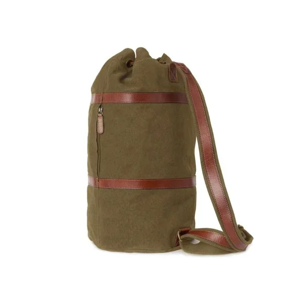 Lightweight, maritime duffel bag in retro vintage design made of canvas and leather for men and women.- Handcrafted from genuine buffalo leather and sturdy cotton- Can be worn across the shoulder like a backpack- Exterior: 2 zipped compartments - Interior: Open compartment- Scope of delivery: 1 duffel bag and 1 dust bagColour: Olive greenWeight: 1 kgCapacity: 40 litresDimensions in cm (HxLxW): 52 x 28 x 28Material: cotton (canvas) and buffalo leather (vegetable tanned), metal parts made of brass