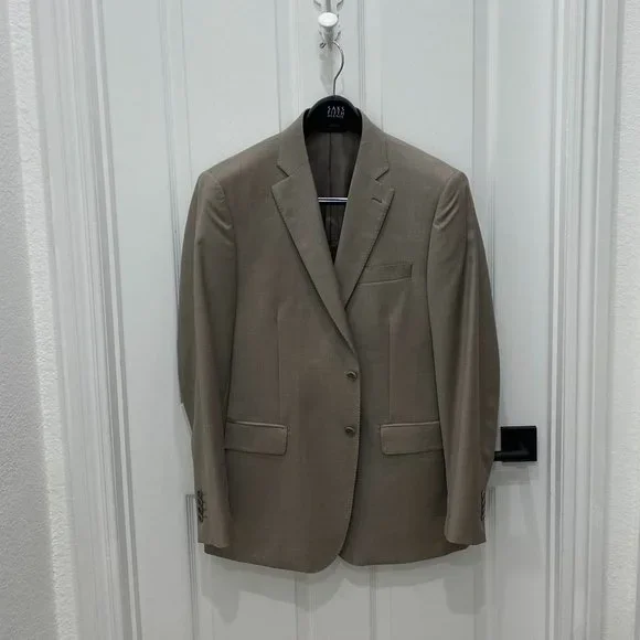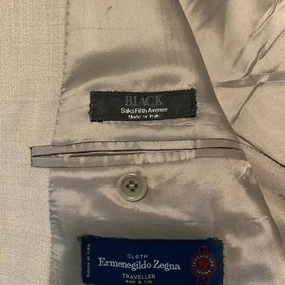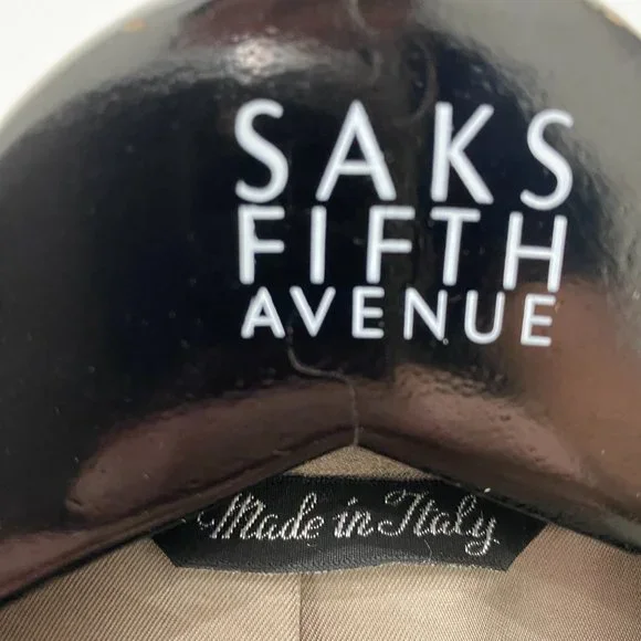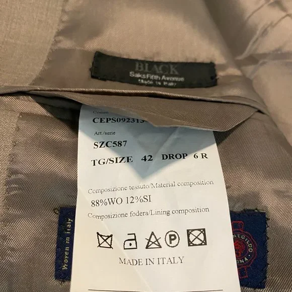 Elevate your style with this stunning Saks Fifth Avenue blazer in a beautiful light brown color. This blazer is designed with a 2 button closure and a regular fit, making it perfect for any occasion. Made in Italy with a luxurious blend of silk and wool, this blazer exudes sophistication and elegance. The jacket/coat length is also regular, providing a comfortable and stylish fit. This blazer is part of the Zegna/Saks Fifth Avenue Black Label collection and is a size 42 regular. The rich brown color, along with the impeccable tailoring, makes this blazer a must-have for any fashion-forward gentleman.