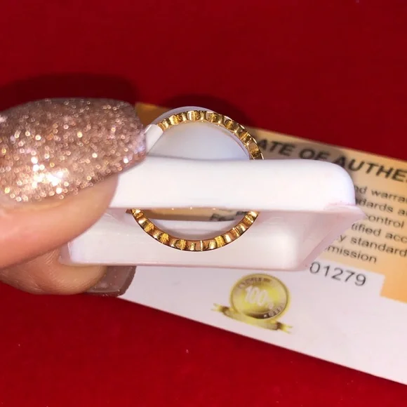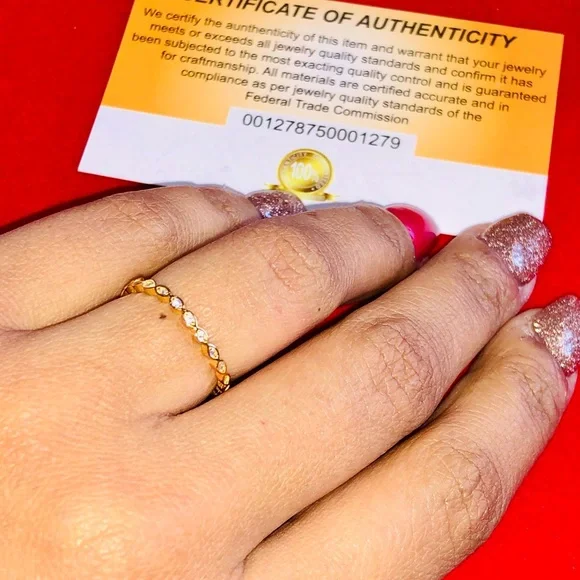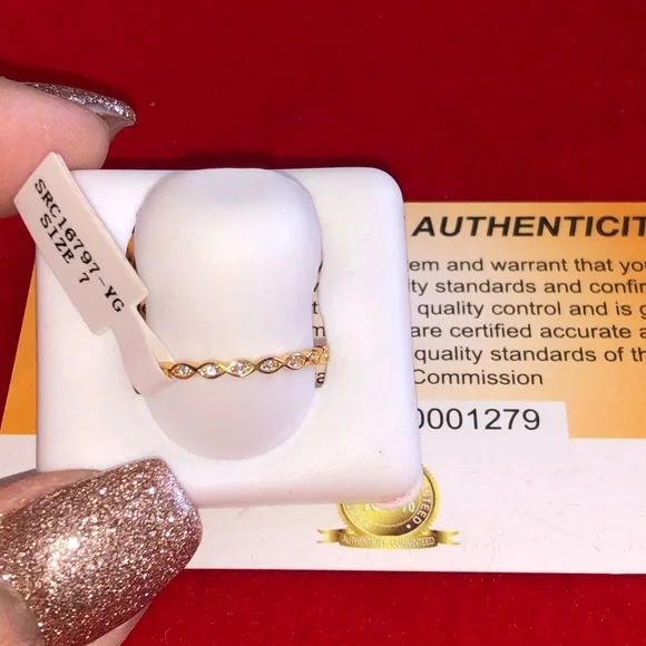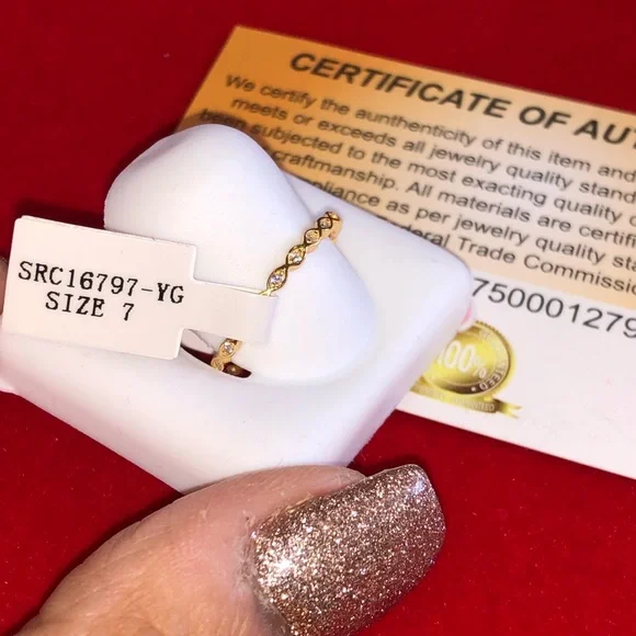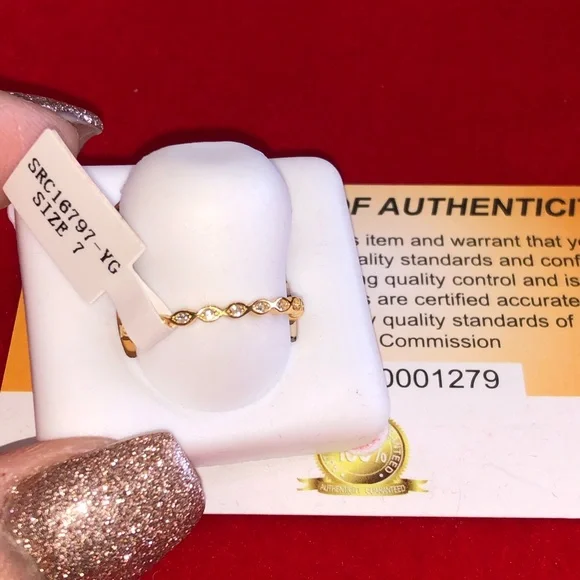 18k yellow Gold Vermeil wedding anniversary band for womenBeautiful diamond cut laser cut design with Swarovski Crystals on genuine 925 stamped sterling silver Size 7Only one made in this design. Comfortable sleek elegant look Daily wear is 100% okayThis ring willNever turn colors ortarnish because it is electroplated in real 18k goldNot refundable