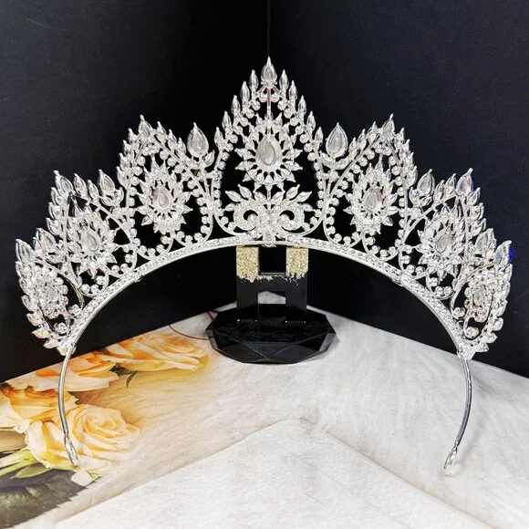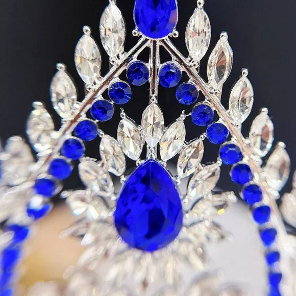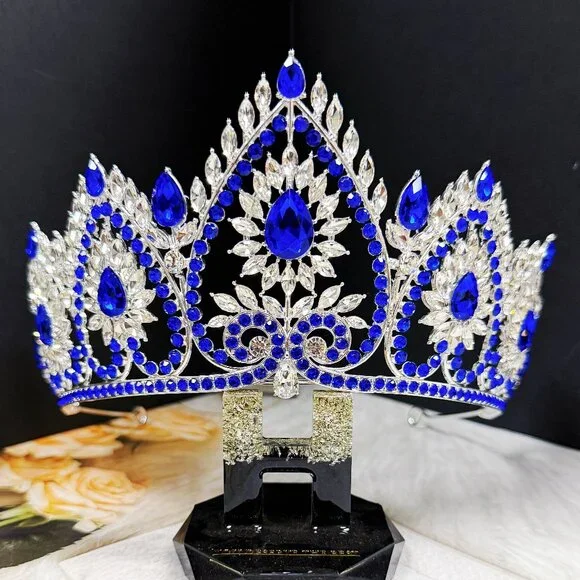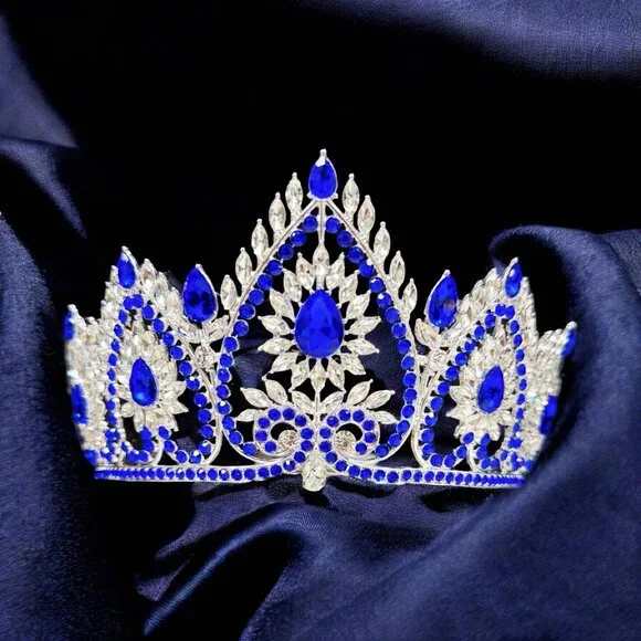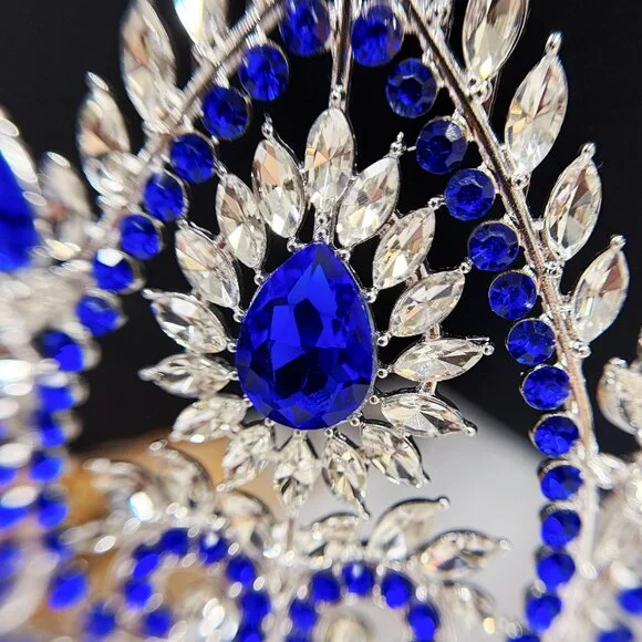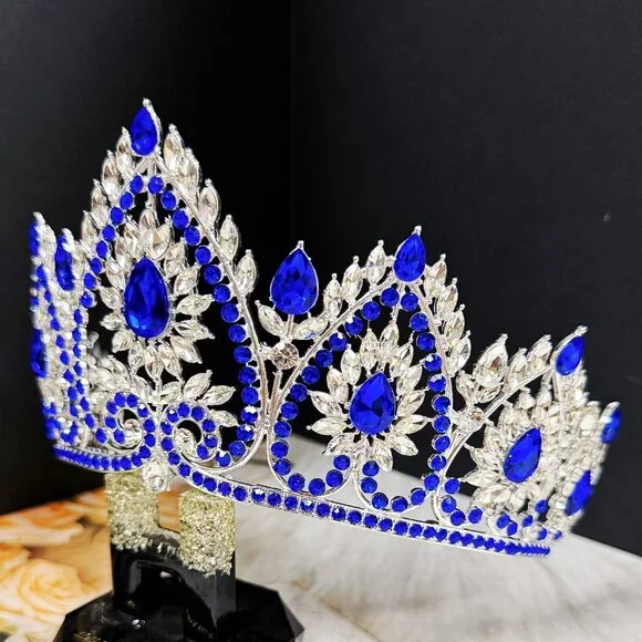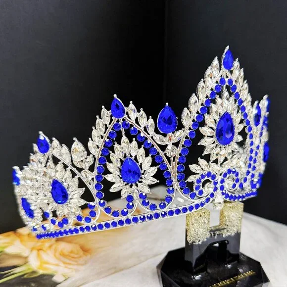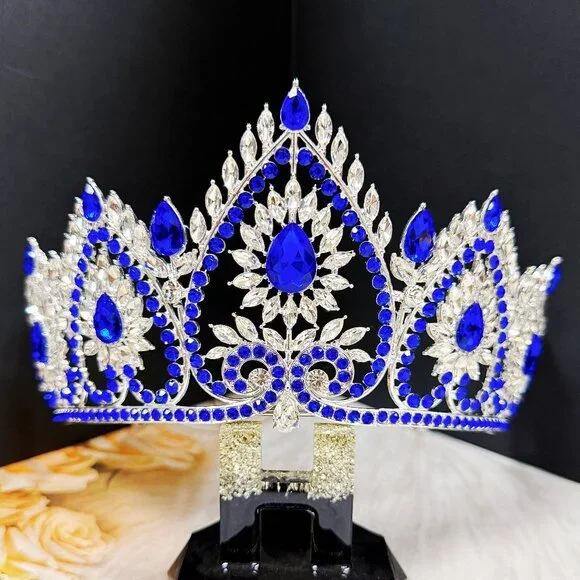 Add a touch of elegance to your special occasion with this stunning handmade flower crown. Perfect for bridesmaids, flower girls, or anyone looking to add a touch of nature to their wedding day look. This silver hair accessory features a beautiful blue stone tiara, made with the finest materials including crystal and rhinestone. The crown is perfect for birthday, prom, pageant, party, cosplay, wedding, gift occasions. This headpiece is sure to make you stand out and feel like a true princess on your special day.Size: 7 inches wide, 3.5 inches in height, large tiara.