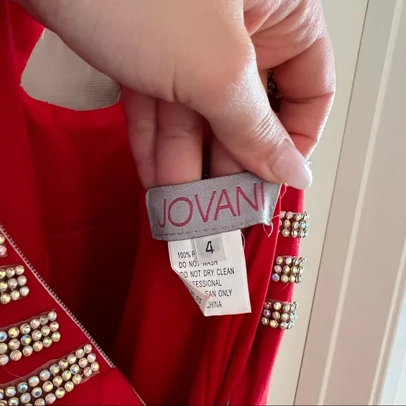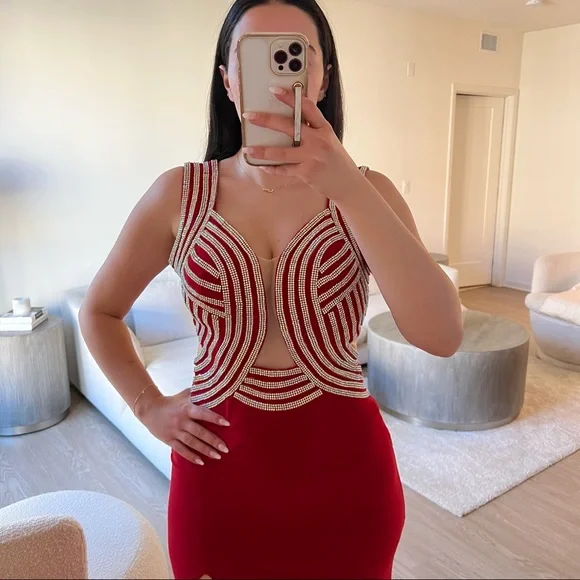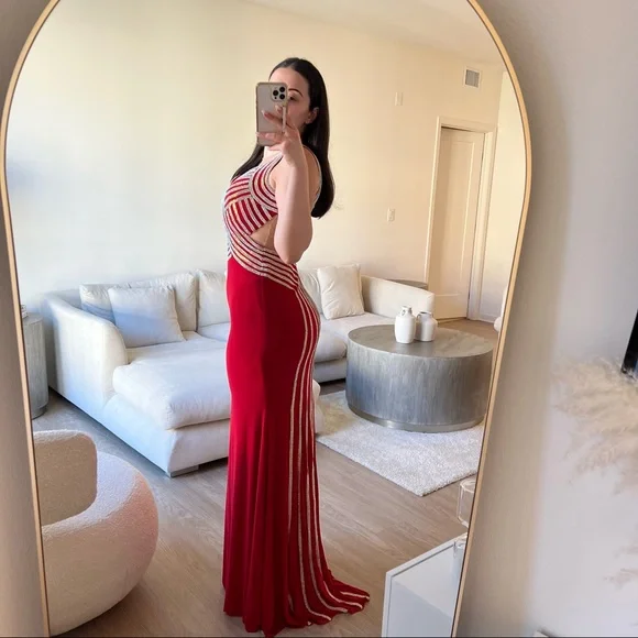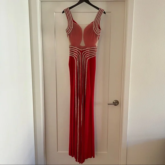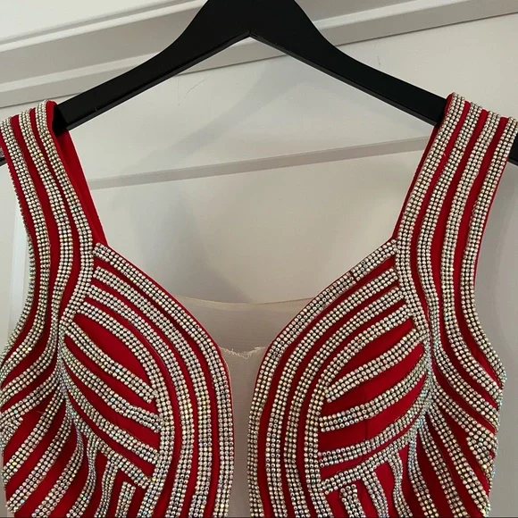 Red embellished evening dress with crystals in the front and beautifully draped in the back with a small train and a side leg slit. Has a sheer nude mesh fabric detail in the back and in the front, double layered, stretchy material, side zipper closure. Fits between a 4-6. Worn twice only in great condition. 100% polyester