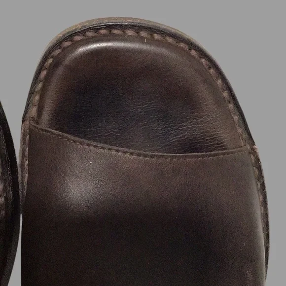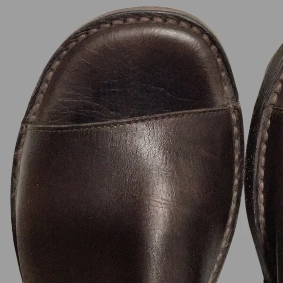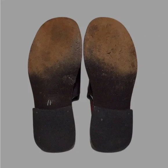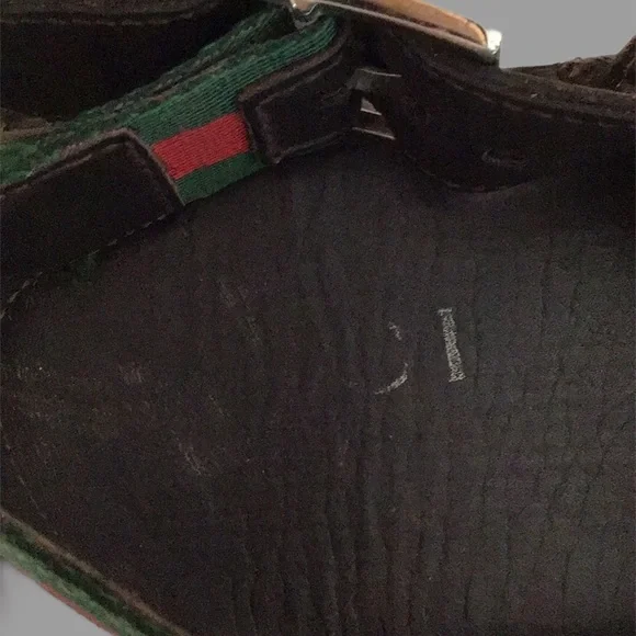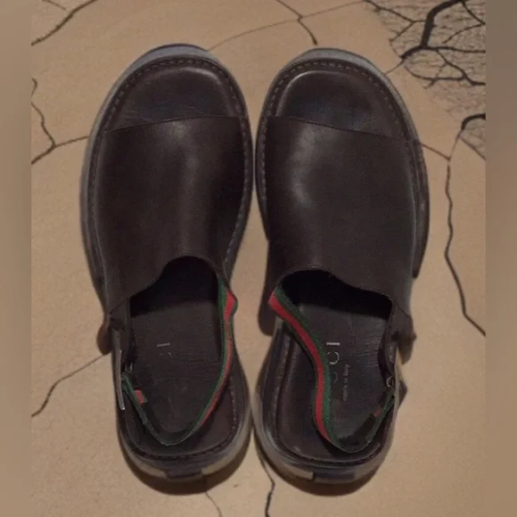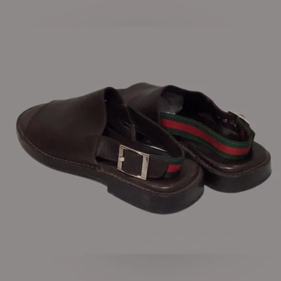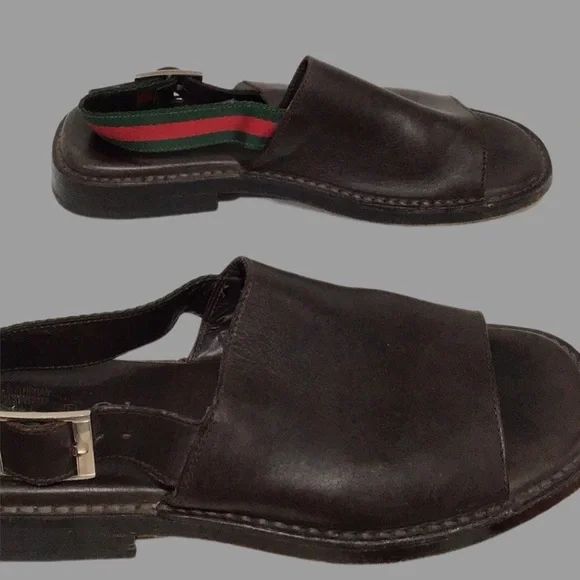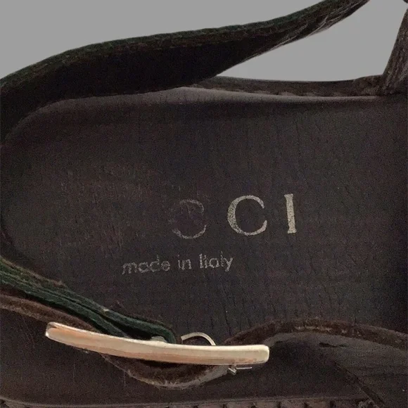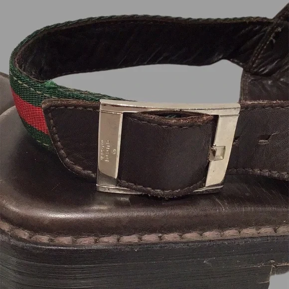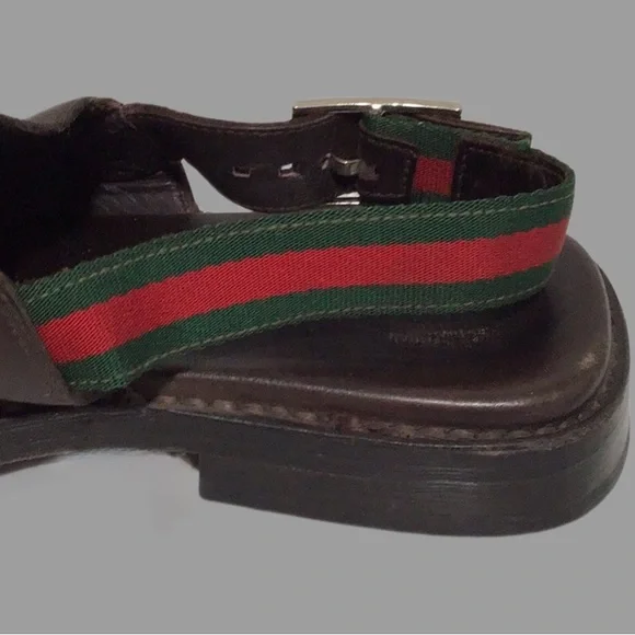 These GUCCI brown leather sandals are in great shape!Details and features include:* Brand: Gucci* Material: Leather* Color: Brown* Size 8D* Measurements: toe to heel 11”* .75” heel* Embossed with logo on each shoe bottom* Sole with Gucci logo worn almost off on one sandal.(See photos)* Gucci green and red straps* Silver buckle with logo embossed* There is some wear on the sandal bottoms.The tops are almost perfect.