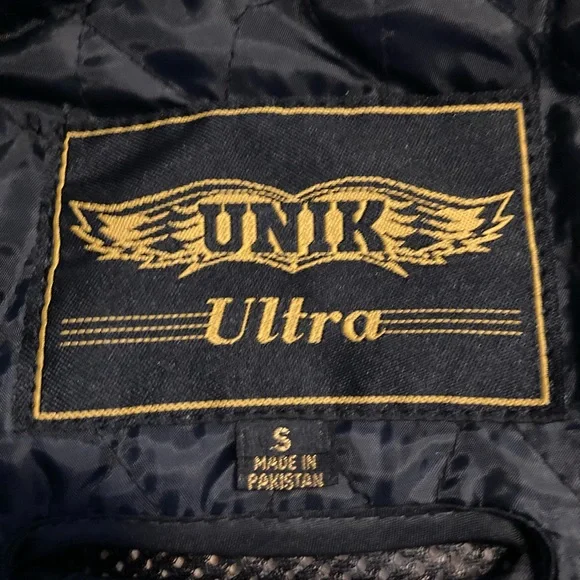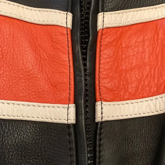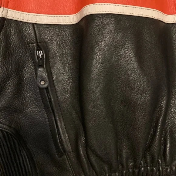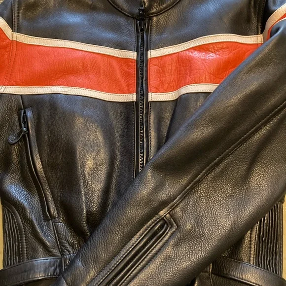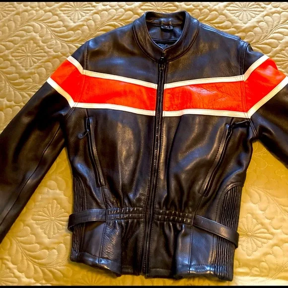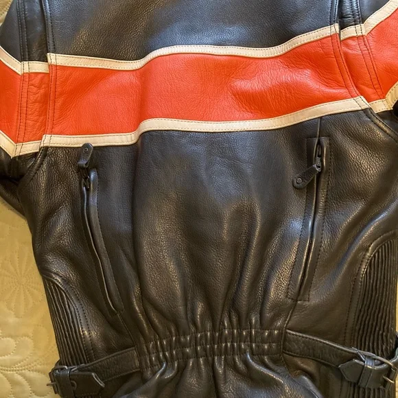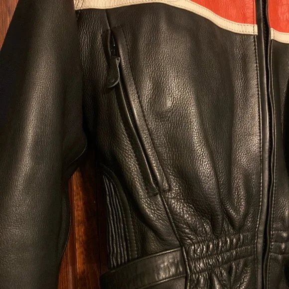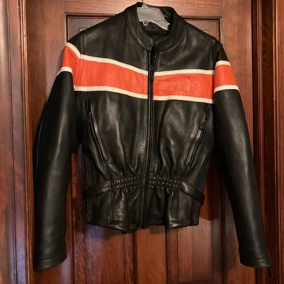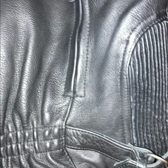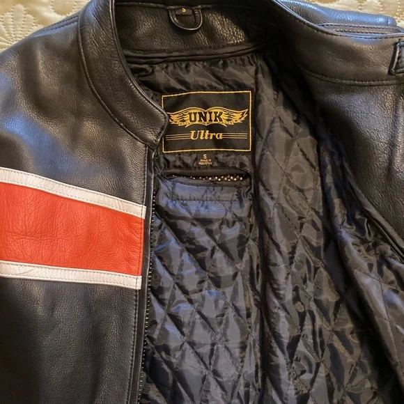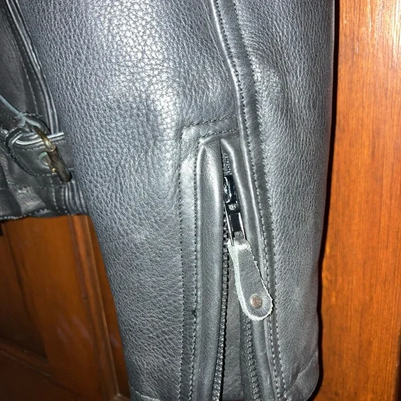 GREAT DEAL ON A GENUINE LEATHER JACKET!!This is a heavy, very well made genuine leather riding jacket. It’s in mint condition. Worn only a few times, It Features zipper front with snap at collar. Zipper front pockets. Back of the jacket has two zipper vent zips. Sleeves have zippers. Side of jacket has straps with buckles for adjusting according style pleats. Removable washable lining, see photos for details of the material. Really nice jacket for true biker wear. Would make an awesome gift. This jacket is in pristine condition. It Will provide style as well as protection. It looks so good that it could be given as a gift. It has been stored in a smoke free environment.