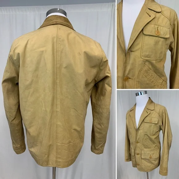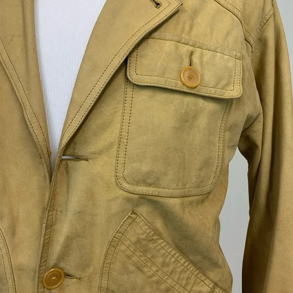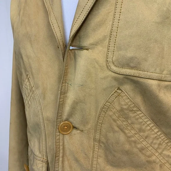 In Good Condition, gently worn; missing one button; small blue pen mark on the front by the buttons.Measurements taken laying flat: Across Shoulders: 19.5"Underarm to underarm: 22.5"Sleeve length: 26"Length (taken on the back of the jacket in the center, from the base of the collar to bottom hem): 28.5"