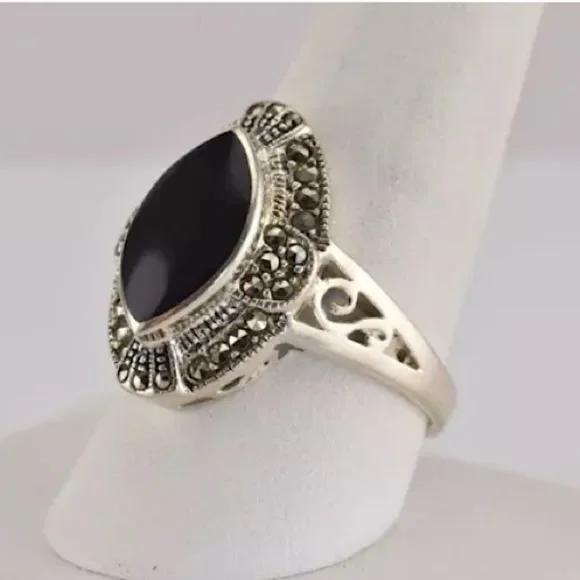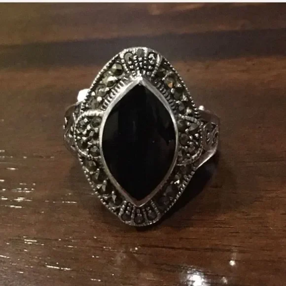 Vintage Marquise Cut Black Onyx Cabochon Sterling Silver and Marcasite RingVintage Black Onyx and Marcasite Ring Sterling Silver, Black Onyx, MarcasiteMarquise Cut Cabochon Black Onyx GemstoneSterling SilverFaceted Marcasite Accents Marked: 925, TH, CPTMade in Thailand Size: 9.5Ask Questions and/or Request Additional Photos, Measurements as NeededColor May Vary Based On Shadows, Lighting, Monitor, Display Settings$250