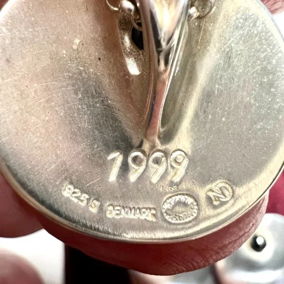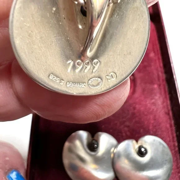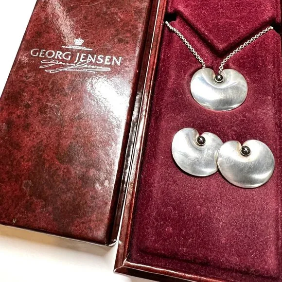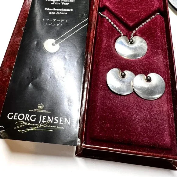 This set was designed and produced by famed Danish designer Georg Jensen.It was designed by the also-famous Nanna Ditzel, and awarded the 1999 Pendant of the Year Prize.This set, in a LilyPad theme, is created of Sterling Silver with a tiny accent of Hematite on each piece.The necklace hangs nearly 20", on a sterling silver chain. The LilyPad pendant is 1" across.The stud earrings are each about ¾" in width. This rare set is out of production, and impossible to find. Especially unworn and in its original box, with the attendant brochure.It is a true collector's item and a must-buy for any Georg Jensen lover.